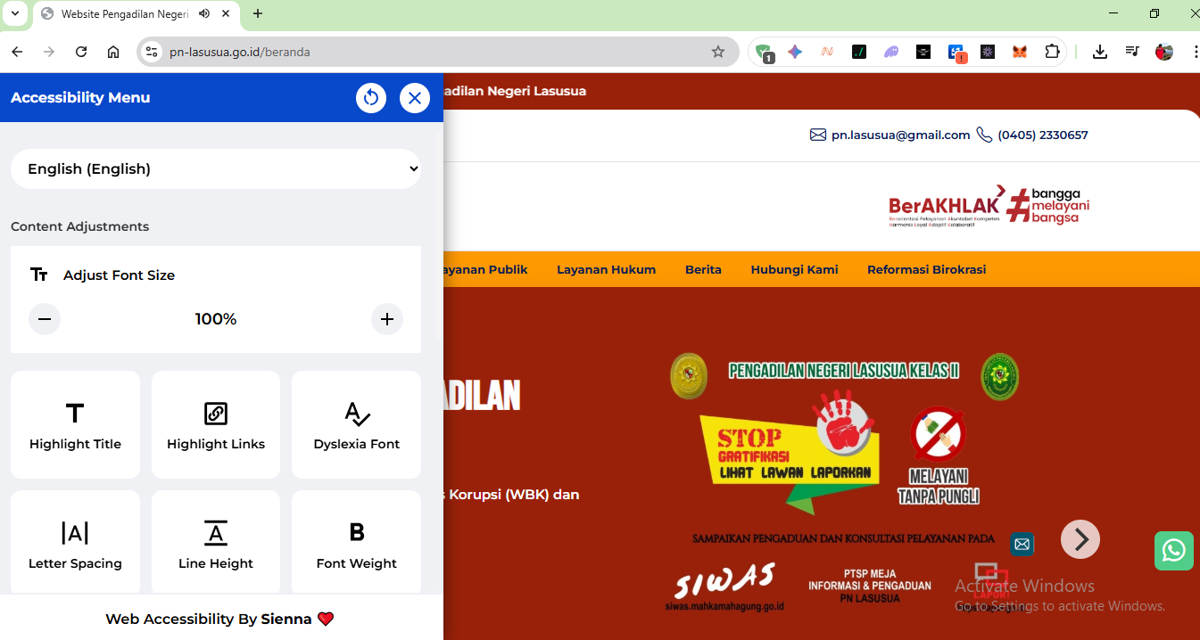 Sarana dan Prasarana bagi Penyandang Disabilitas menyesuaikan dengan Akreditasi Penjaminan Mutu (APM) Badan Peradilan Umum mengacu pada Surat Keputusan Direktur Jenderal Badan Peradilan Umum Mahkamah Agung Republik Indonesia Nomor 1692/DJU/SK/PS.00/12/2020 tertanggal 22 Desember 2020, tentang Pedoman Pelaksanaan Pelayanan Bagi Penyandang Disabilitas di Pengadilan Tinggi dan Pengadilan Negeri. Berikut Sarana dan Prasarana bagi Penyandang Disabilitas di Pengadilan Negeri Lasusua :