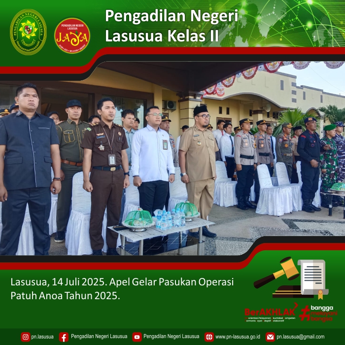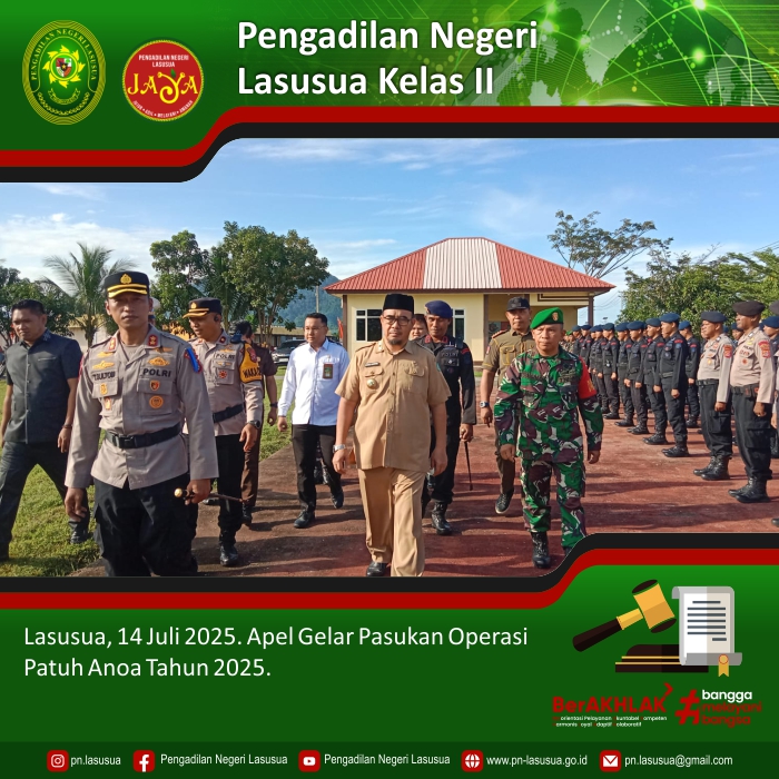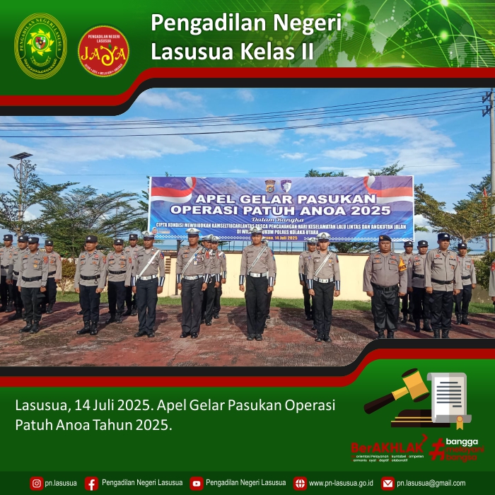 Lasusua, 14 Juli 2025 - Hakim Pengadilan Negeri Lasusua Bapak Lian Christo Sianturi, S.H. menghadiri Apel Gelar Pasukan Operasi Patuh Anoa 2025 dalam rangka Cipta kondisi mewujudkan Kamseltibcarlantas pasca pencanangan hari keselamatan lalulintas dan angkutan jalan di wilayah hukum Polres Kolaka Utara yang diselenggarakan di Halaman Kantor Polres Kolaka Utara.