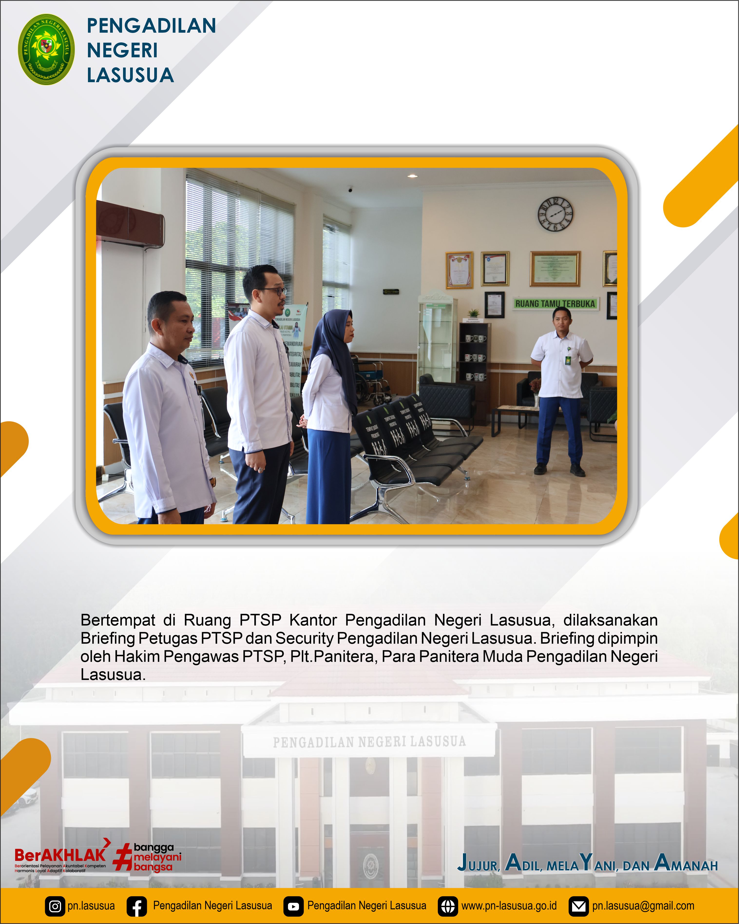 Lasusua, 27 Oktober 2025 - Bertempat di Ruang PTSP Kantor Pengadilan Negeri Lasusua, dilaksanakan Briefing Petugas PTSP dan Security Pengadilan Negeri Lasusua. Briefing dipimpin oleh Hakim Pengawas PTSP, Plt.Panitera, Para Panitera Muda Pengadilan Negeri Lasusua.