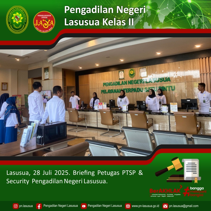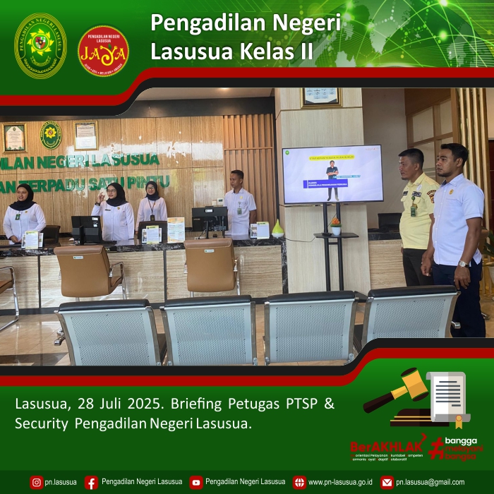 Lasusua, 28 Juli 2025 - Bertempat di Ruang PTSP Kantor Pengadilan Negeri Lasusua, dilaksanakan Briefing Petugas PTSP dan Security Pengadilan Negeri Lasusua. Briefing dipimpin oleh Hakim Pengawas PTSP, Panitera, Para Panitera Muda Pengadilan Negeri Lasusua.
