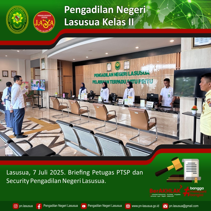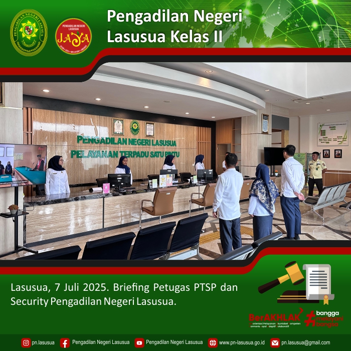 Lasusua, 7 Juli 2025 - Bertempat di Ruang PTSP Kantor Pengadilan Negeri Lasusua, dilaksanakan Briefing Petugas PTSP dan Security Pengadilan Negeri Lasusua. Briefing dipimpin oleh Hakim Pengawas PTSP, Panitera, dan Panitera Muda Pidana.