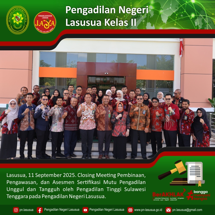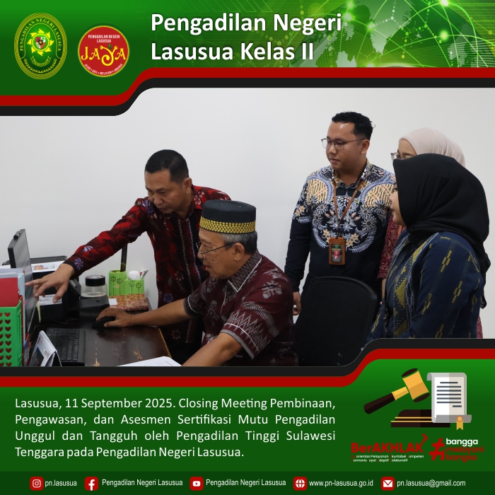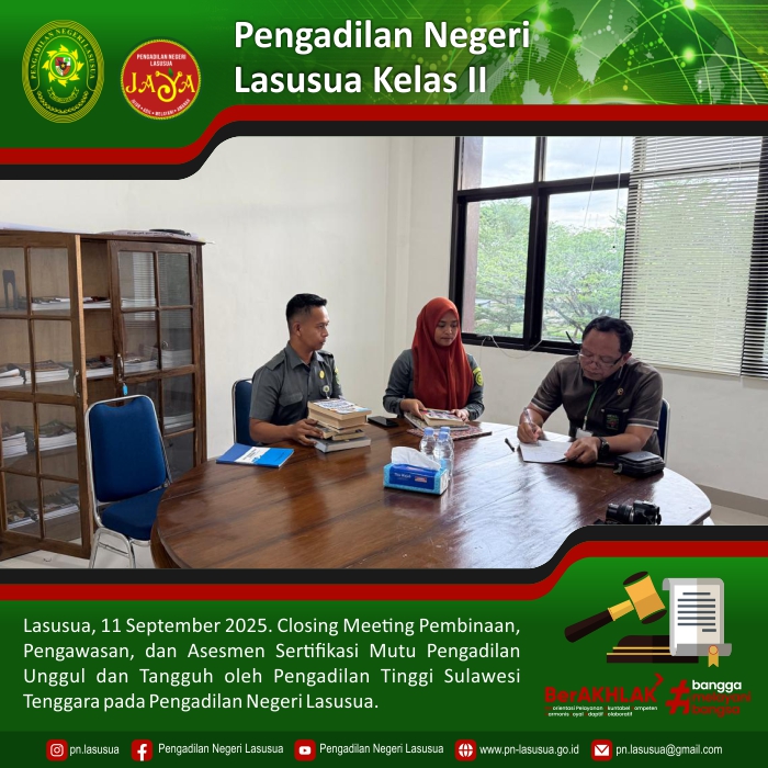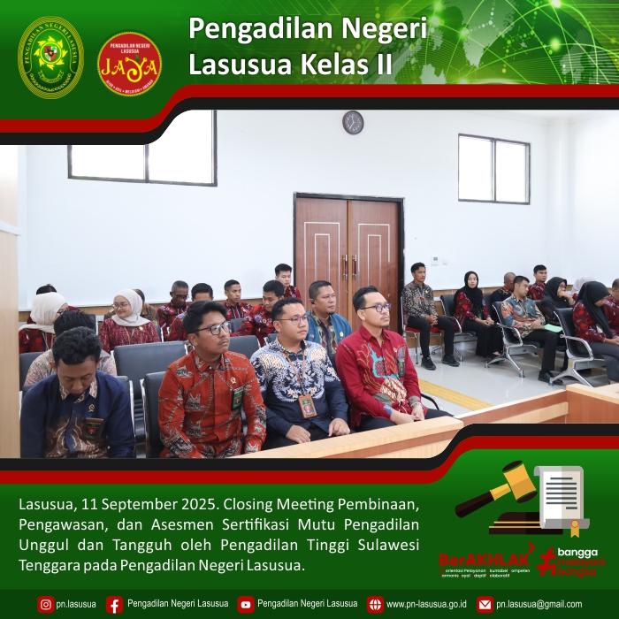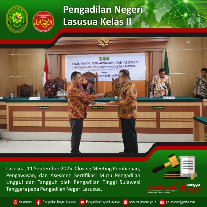 Lasusua, 11 September 2025 - Kegiatan Closing Meeting, Pembinaan, Pengawasan, dan Asesmen Sertifikasi Mutu Pengadilan Unggul dan Tangguh oleh Pengadilan Tinggi Sulawesi Tenggara pada Pengadilan Negeri Lasusua yang dipimpin langsung Oleh YM. Ketua Pengadilan Tinggi Sulawesi Tenggara.