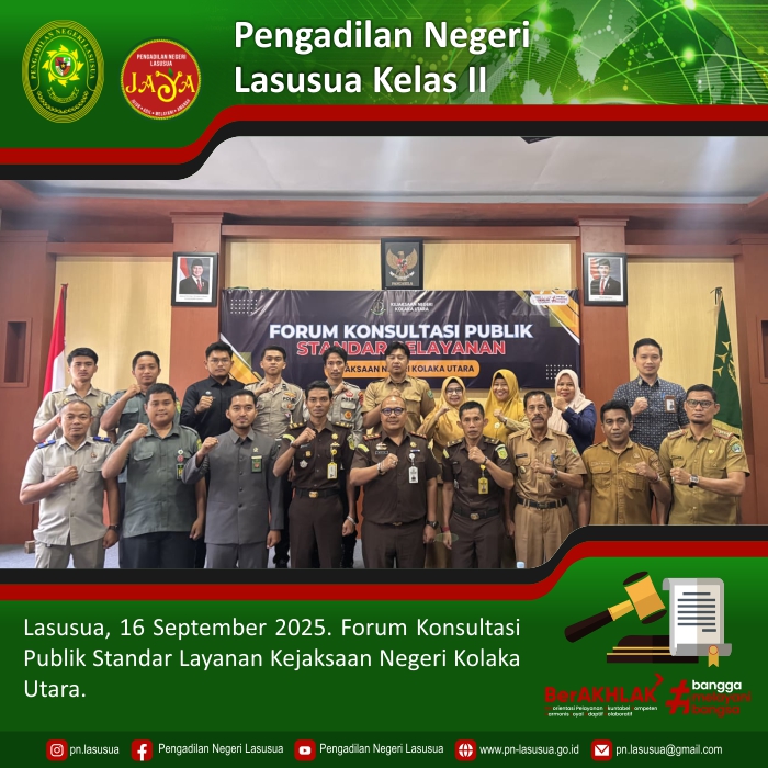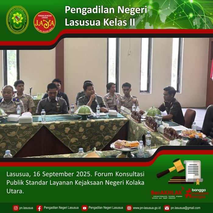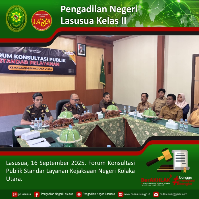 Lasusua, 16 September 2025 - Bertempat di Kantor Kejaksaan Negeri Kolaka Utara, dilaksanakan Kegiatan Forum Konsultasi Publik Standar Layanan Kejaksaan Negeri Kolaka Utara yang di ikuti oleh Staf Kepaniteraan Pidana dan Perdata Pengadilan Negeri Lasusua.