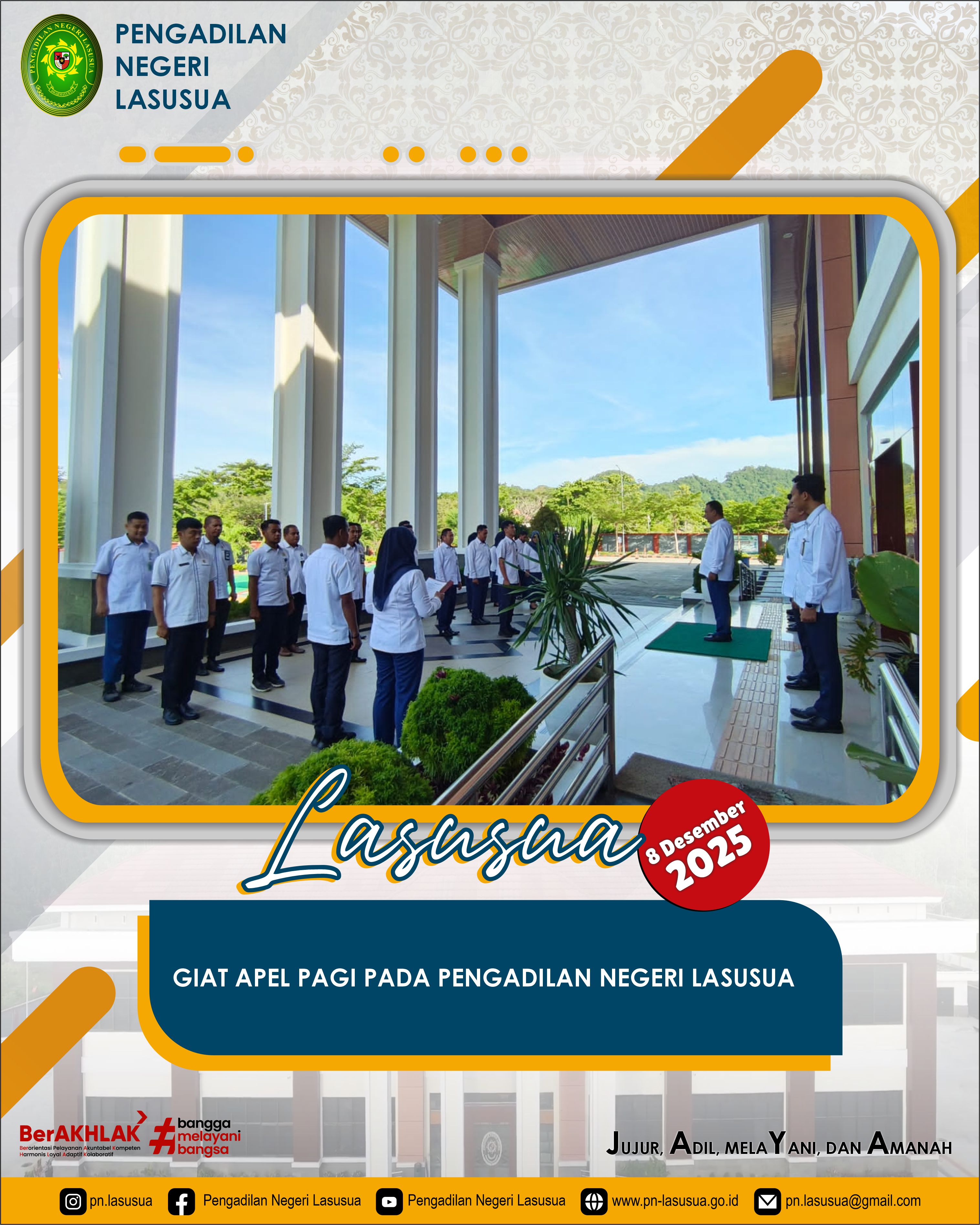 Lasusua, 8 Desmber 2025 - Bertempat di halaman depan Kantor Pengadilan Negeri Lasusua, dilaksanakan Kegiatan Rutin Apel Pagi Hari Senin. Pembina apel yaitu ketua Pengadilan Negeri Lasusua Bapak Alfonsus Nahak, S.H.,M.H. Dalam amanatnya Pembina apel menyampaikan selamat datang kembali dan selamat untuk aparatur pengadilan Negeri lasusua atas kerja keras dan pencapainnya mendapat predikat AMPUH. Pembina Apel juga mengingatkan kepada Hakim, Sekretaris, Panitera, Kasubbag, Panitera Muda, Panitera Pengganti, Pejabat Fungsional, Jurusita, dan Jurusita Pengganti agar mengikuti Rapat Sakip pada pukul 09.00 dirungan Rapat Pengadilan Negeri Lasusua.