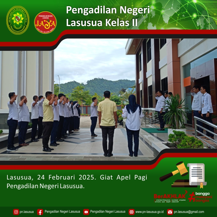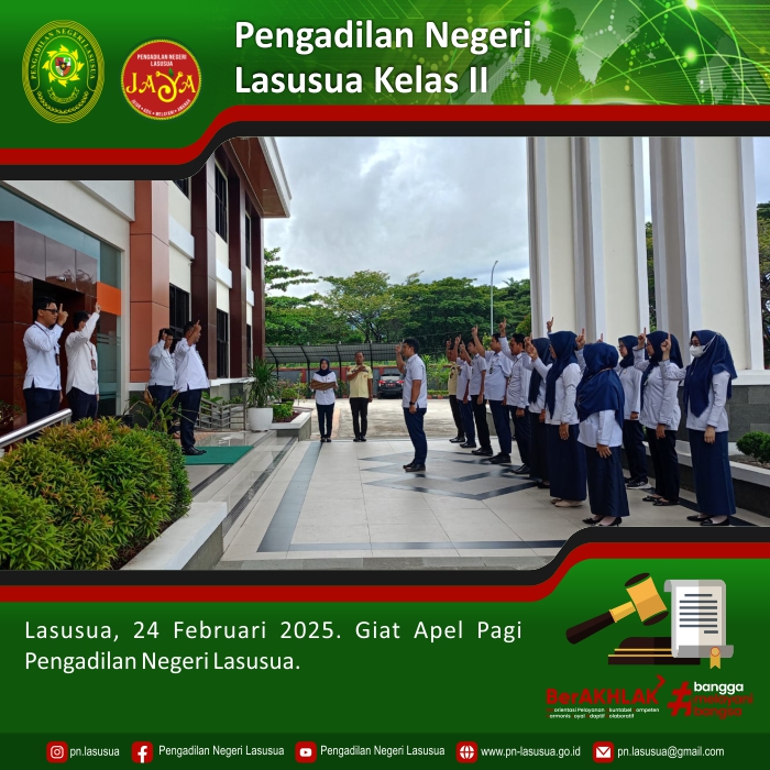 Lasusua, 24 Februari 2025 - Bertempat di halaman depan Kantor Pengadilan Negeri Lasusua, dilaksanakan Kegiatan Rutin Apel Pagi Hari Senin. Pembina apel yaitu Ketua Pengadilan Negeri Lasusua Bapak Alfonsus Nahak, S.H., M.H. Dalam amanatnya Pembina apel menyampaikan untuk eviden AMPUH, ZI, dan tindaklanjut Bawas agar dapat mulai dikerjakan, kemudian juga menyampaikan agar bersemangat dalam bekerja, selalu menjaga kekompakan dan keharmonisan dalam bekerja serta selalu menjaga kesehatan. Apel ditutup dengan doa bersama.