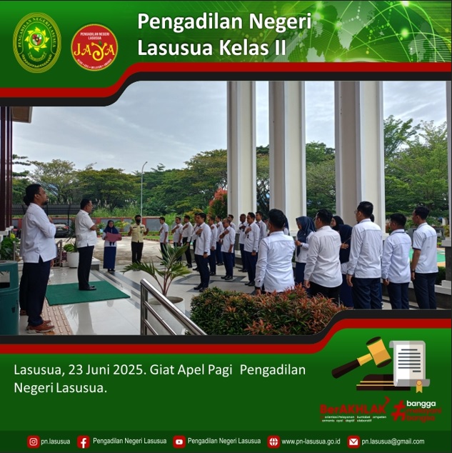 Lasusua, 23 Juni 2025 - Bertempat di halaman depan Kantor Pengadilan Negeri Lasusua, dilaksanakan Kegiatan Rutin Apel Pagi Hari Senin. Pembina apel yaitu Ketua Pengadilan Negeri Lasusua Bapak Alfonsus Nahak, S.H., M.H. Dalam amanatnya Pembina apel menyampaikan ucapan selamat datang kepada calon hakim dan mempersilahkan untuk memperkenalkan diri secara singkat dan juga menyampaikan agar tetap selalu bersemangat dalam bekerja, selalu menjaga kekompakan dan keharmonisan dalam bekerja serta selalu menjaga kesehatan. Apel ditutup dengan doa bersama.