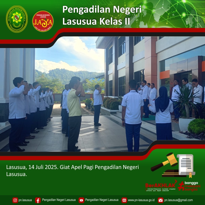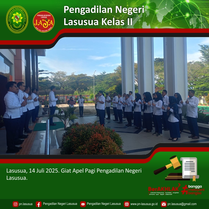 Lasusua, 14 Juli 2025 - Bertempat di halaman depan Kantor Pengadilan Negeri Lasusua, dilaksanakan Kegiatan Rutin Apel Pagi Hari Senin. Pembina apel yaitu Hakim Pengadilan Negeri Lasusua Bapak Bentiga Naraotama, S.H. Dalam amanatnya Pembina apel menyampaikan agar tetap selalu bersemangat dalam bekerja, selalu menjaga kekompakan dan keharmonisan dalam bekerja serta selalu menjaga kesehatan. Apel ditutup dengan doa bersama.