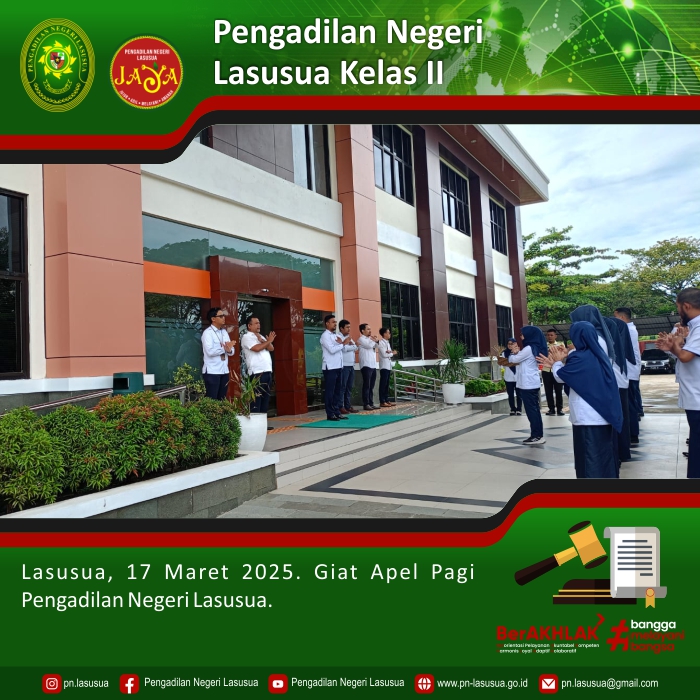 Lasusua, 17 Maret 2025 - Bertempat di halaman depan Kantor Pengadilan Negeri Lasusua, dilaksanakan Kegiatan Rutin Apel Pagi Hari Senin. Pembina apel yaitu Hakim Pengadilan Negeri Lasusua Bapak La Rusman, S.H. Dalam amanatnya Pembina apel menyampaikan banyaknya agenda pada minggu ini seperti Zona Integritas (ZI), Penilaian Kinerja, dan AMPUH agar tetap selalu bersemangat dalam bekerja, selalu menjaga kekompakan dan keharmonisan dalam bekerja serta selalu menjaga kesehatan. Apel ditutup dengan doa bersama.