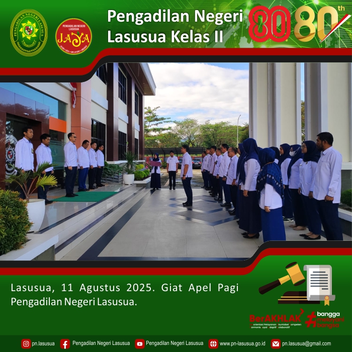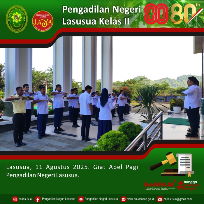 Lasusua, 11 Agustus 2025 - Bertempat di halaman depan Kantor Pengadilan Negeri Lasusua, dilaksanakan Kegiatan Rutin Apel Pagi Hari Senin. Pembina apel yaitu Hakim Pengadilan Negeri Lasusua Bapak Satria Perdana, S.H., M.H. Dalam amanatnya Pembina apel menyampaikan agar tetap selalu bersemangat dalam bekerja, selalu menjaga kekompakan dan keharmonisan dalam bekerja serta selalu menjaga kesehatan. Pada hari ini akan dilaksanakan rapat bulanan, agar dapat dipersiapkan dengan baik. Apel ditutup dengan doa bersama.