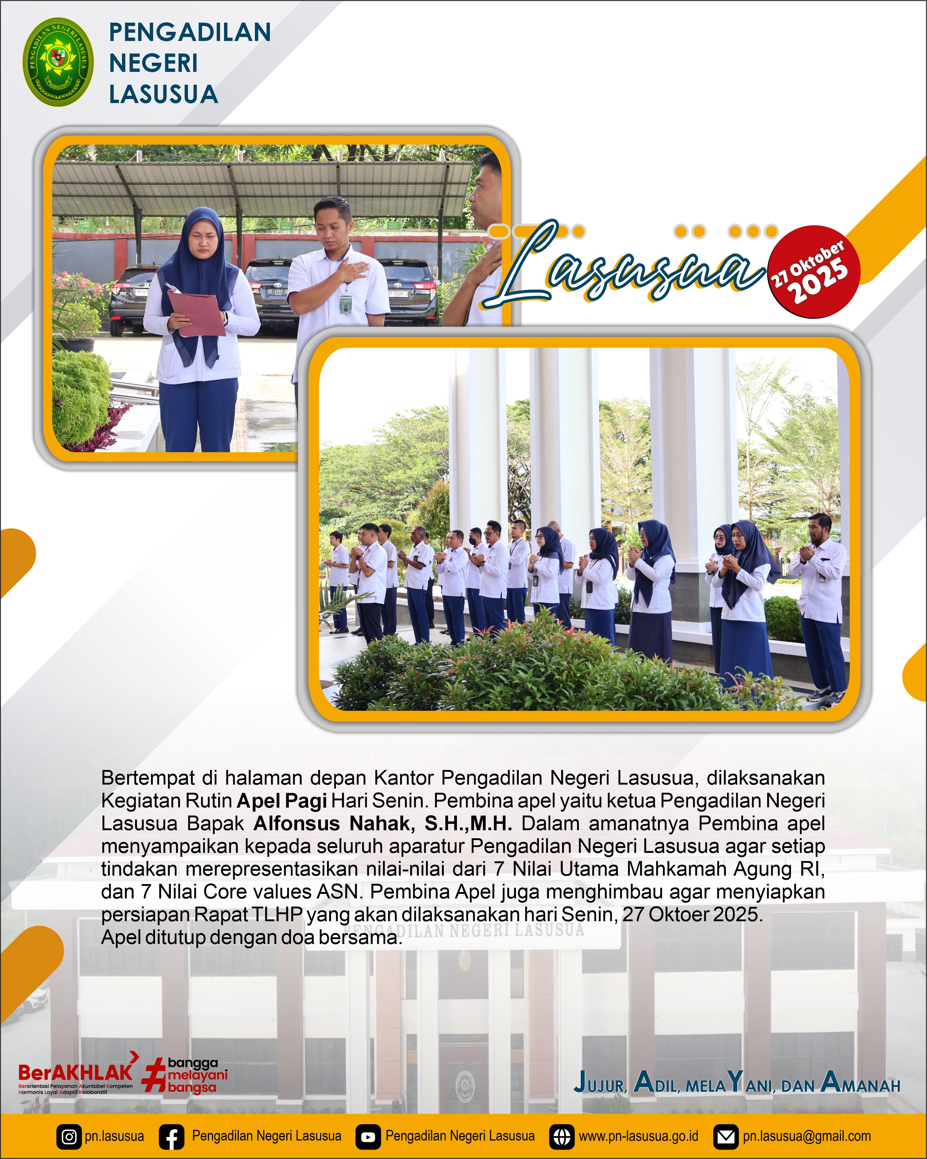 Lasusua, 27 Oktober 2025 - Bertempat di halaman depan Kantor Pengadilan Negeri Lasusua, dilaksanakan Kegiatan Rutin Apel Pagi Hari Senin. Pembina apel yaitu ketua Pengadilan Negeri Lasusua Bapak Alfonsus Nahak, S.H.,M.H. Dalam amanatnya Pembina apel menyampaikan kepada seluruh aparatur Pengadilan Negeri Lasusua agar setiap tindakan merepresentasikan nilai-nilai dari 7 Nilai Utama Mahkamah Agung RI, dan 7 Nilai Core values ASN. Pembina Apel juga menghimbau agar menyiapkan persiapan Rapat TLHP yang akan dilaksanakan hari Senin, 27 Oktoer 2025.