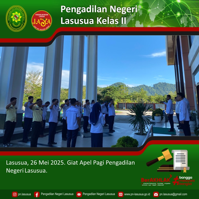 Lasusua, 26 Mei 2025 - Bertempat di halaman depan Kantor Pengadilan Negeri Lasusua, dilaksanakan Kegiatan Rutin Apel Pagi Hari Senin. Pembina apel yaitu Hakim Pengadilan Negeri Lasusua Bapak La Rusman, S.H. Dalam amanatnya Pembina apel menyampaikan jam 9 WITA akan dilaksanakan rapat tindaklanjut hasil pengawasan bidang dan monitoring dokumen AMPUH, agar dapat dipersiapkan dengan baik dan juga agar tetap selalu bersemangat dalam bekerja, selalu menjaga kekompakan dan keharmonisan dalam bekerja serta selalu menjaga kesehatan. Apel ditutup dengan doa bersama.