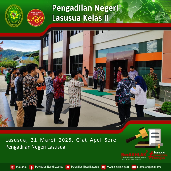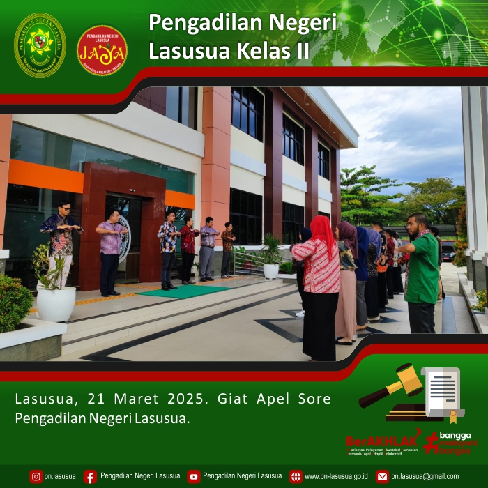 Lasusua, 21 Maret 2025 - Bertempat di halaman depan Kantor Pengadilan Negeri Lasusua, dilaksanakan Kegiatan Rutin Apel Sore Hari Jumat. Pembina apel yaitu Hakim Pengadilan Negeri Lasusua Bapak La Rusman, S.H. Dalam amanatnya Pembina apel mengucapkan terimakasih atas kerja keras yang telah dilakukan pada minggu ini, agar berhati-hati dalam perjalanan pulang serta selalu menjaga kesehatan. Apel ditutup dengan doa bersama.