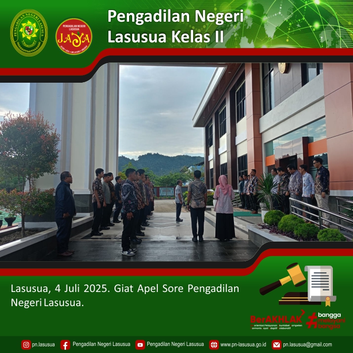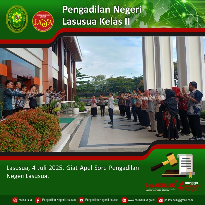 Lasusua, 4 Juli 2025 - Bertempat di halaman depan Kantor Pengadilan Negeri Lasusua, dilaksanakan Kegiatan Rutin Apel Sore Hari Jumat. Pembina apel yaitu Hakim Pengadilan Negeri Lasusua Bapak La Rusman, S.H. Dalam amanatnya Pembina apel mengucapkan terimakasih atas kerja keras yang telah dilakukan pada minggu ini dan agar berhati-hati dalam perjalanan pulang serta selalu menjaga kesehatan. Apel ditutup dengan doa bersama.