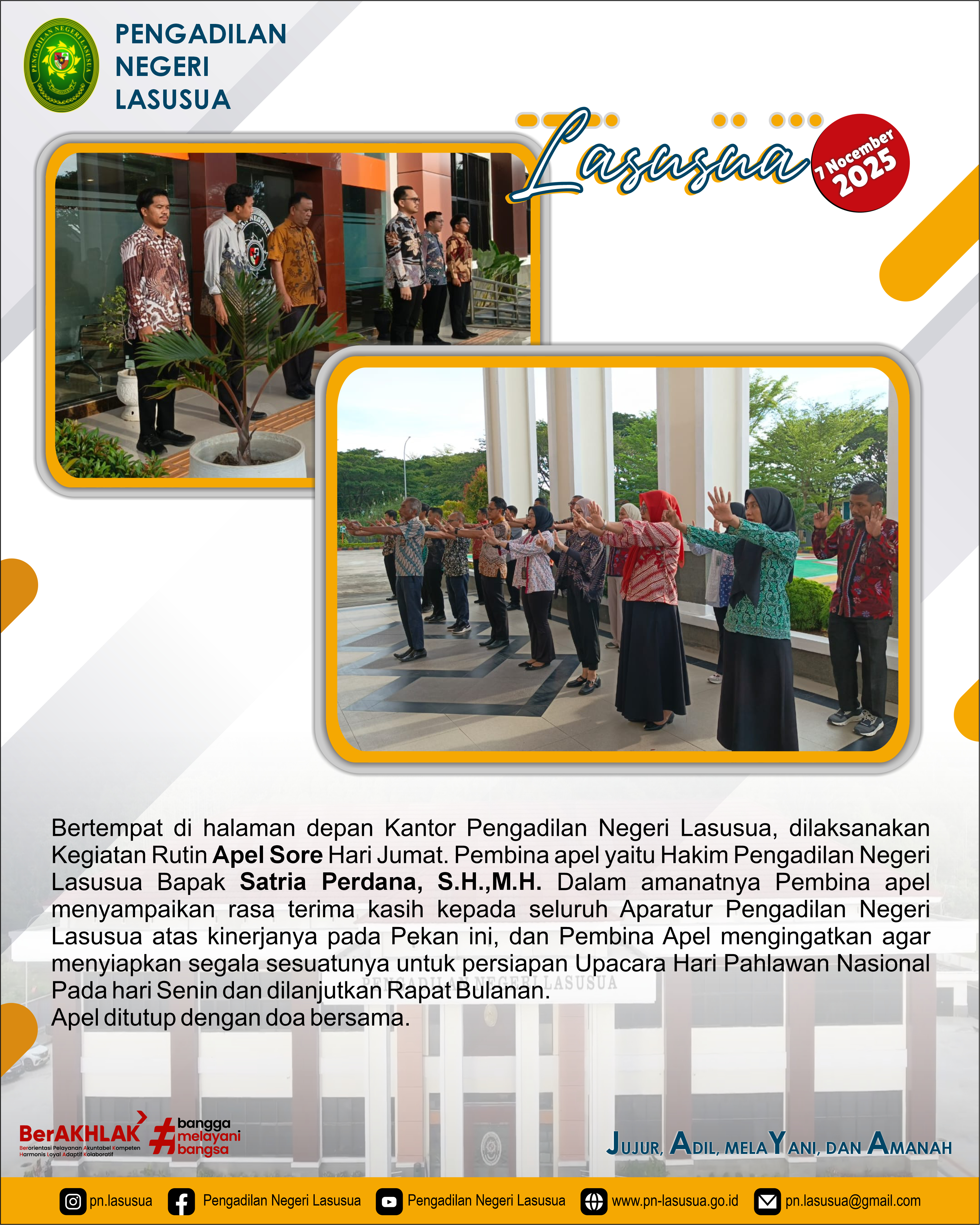Lasusua, 7 November 2025 - Bertempat di halaman depan Kantor Pengadilan Negeri Lasusua, dilaksanakan Kegiatan Rutin Apel Sore Hari Jumat. Pembina apel yaitu Hakim Pengadilan Negeri Lasusua Bapak Satria Perdana, S.H.,M.H. Dalam amanatnya Pembina apel menyampaikan rasa terima kasih kepada seluruh Aparatur Pengadilan Negeri Lasusua atas kinerjanya pada Pekan ini, dan Pembina Apel mengingatkan agar menyiapkan segala sesuatunya untuk persiapan Upacara Hari Pahlawan Nasional Pada hari Senin dan dilanjutkan Rapat Bulanan.