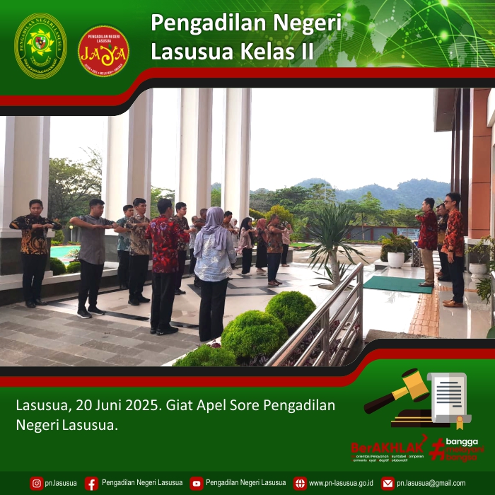 Lasusua, 20 Juni 2025 - Bertempat di Ruang Command Center Pengadilan Negeri Lasusua dilaksanakan Pertemuan Rutin dan Sarasehan Interaktif Badan Peradilan Umum (Perisai Badilum) Episode ke-7 secara daring yang di ikuti Ketua Pengadilan Negeri Lasusua, Para Hakim, Para Panmud, Panitera Pengganti, dan Jurusita Pengadilan Negeri Lasusua.
