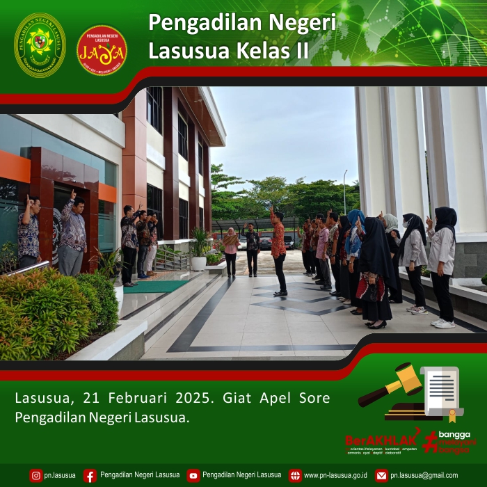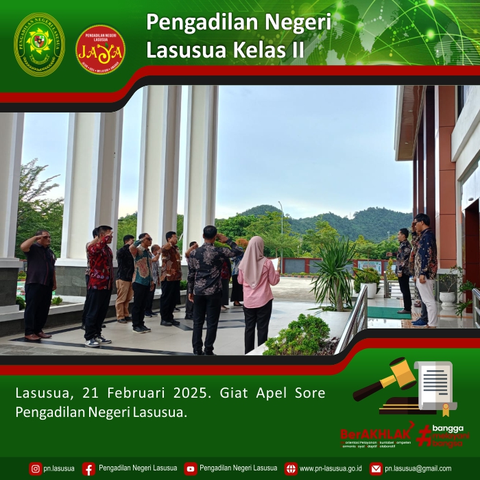 Lasusua, 21 Februari 2025 - Bertempat di halaman depan Kantor Pengadilan Negeri Lasusua, dilaksanakan Kegiatan Rutin Apel Sore Hari Jumat. Pembina apel yaitu Plh. Ketua Pengadilan Negeri Lasusua Bapak Arum Sejati, S.H. Dalam amanatnya Pembina apel mengucapkan terimakasih atas kerja keras yang telah dilakukan pada minggu ini dan menyampaikan yang agar berhati-hati dalam perjalanan pulang serta selalu menjaga kesehatan. Apel ditutup dengan doa bersama.