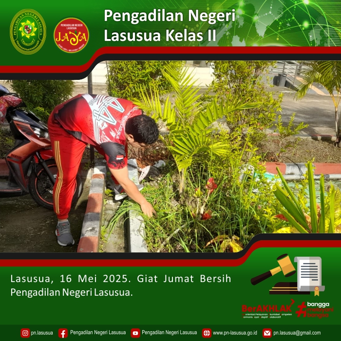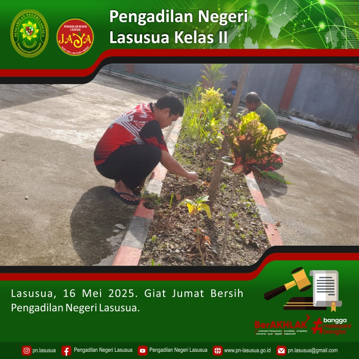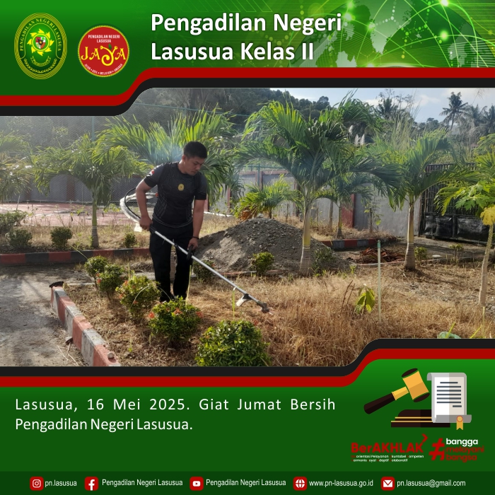 Lasusua, 16 Mei 2025 - Aparatur Pengadilan Negeri Lasusua melaksanakan kegiatan kerja bakti bersama, antara lain membersihan halaman belakang kantor. Hasilnya, lingkungan kantor Pengadilan Negeri Lasusua menjadi bersih, rapi, dan elok dipandang.