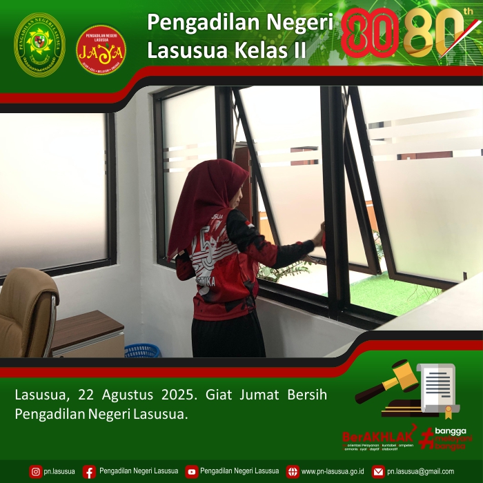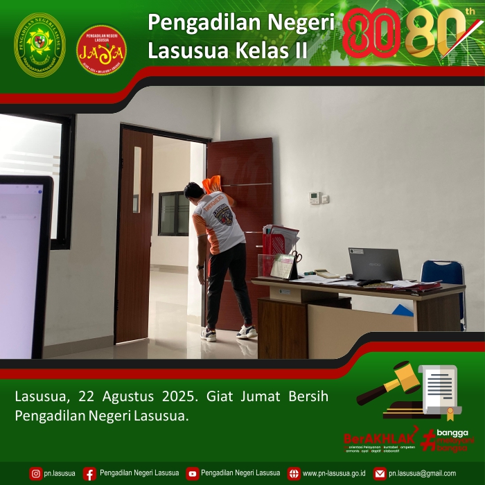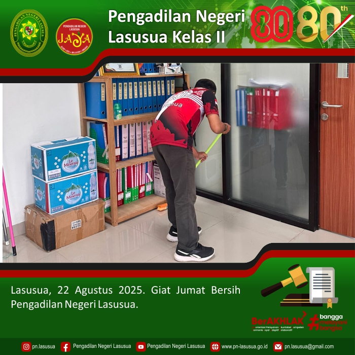 Lasusua, 22 Agustus 2025 - Aparatur Pengadilan Negeri Lasusua melaksanakan kegiatan kerja bakti bersama, antara lain membersihan ruang-ruang kantor. Hasilnya, lingkungan kantor Pengadilan Negeri Lasusua menjadi bersih, rapi, dan elok dipandang.