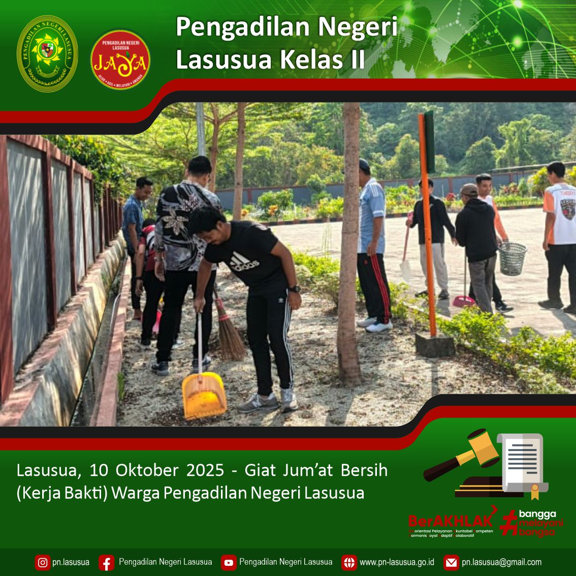 Lasusua, 10 Oktober 2025 - Aparatur Pengadilan Negeri Lasusua melaksanakan kegiatan kerja bakti bersama, antara lain membersihan halaman depan dan belakang kantor. Hasilnya, lingkungan kantor Pengadilan Negeri Lasusua menjadi bersih, rapi, dan elok dipandang.