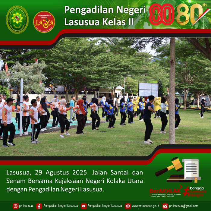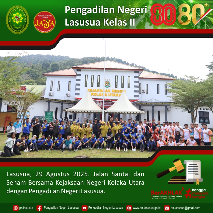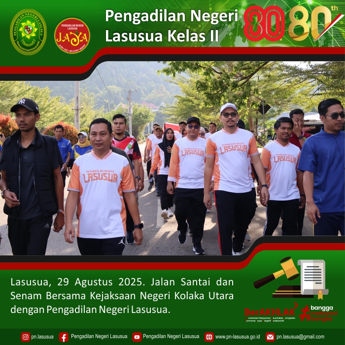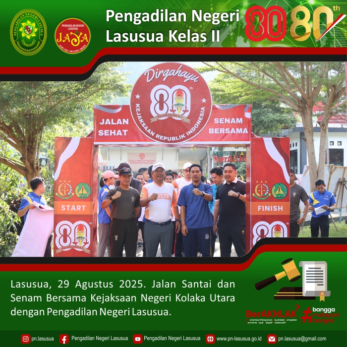 Lasusua, 29 Agustus 2025 - Bertempat di halaman depan Kantor Kejaksaan Negeri Kolaka Utara, dilaksanakan Kegiatan Jalan Santai dan Senam Bersama Kejaksaan Negeri Kolaka Utara dengan Pengadilan Negeri Lasusua. Kegiatan dilaksanakan dalam rangka memperingati Hari Lahir Kejaksaan Republik Indonesia ke-80.