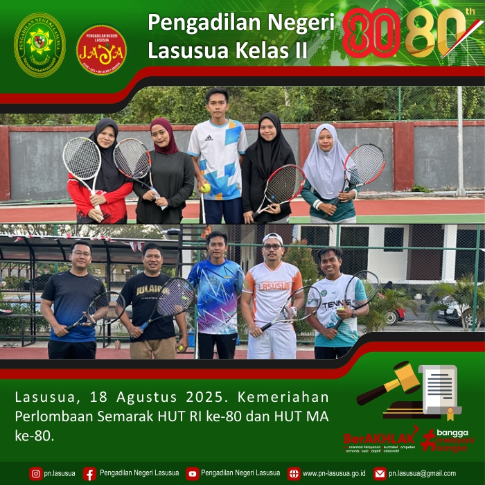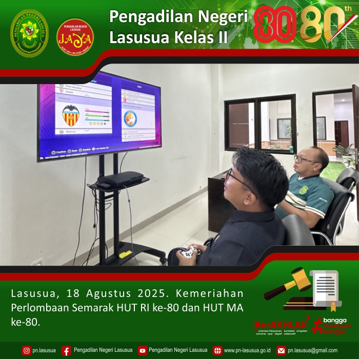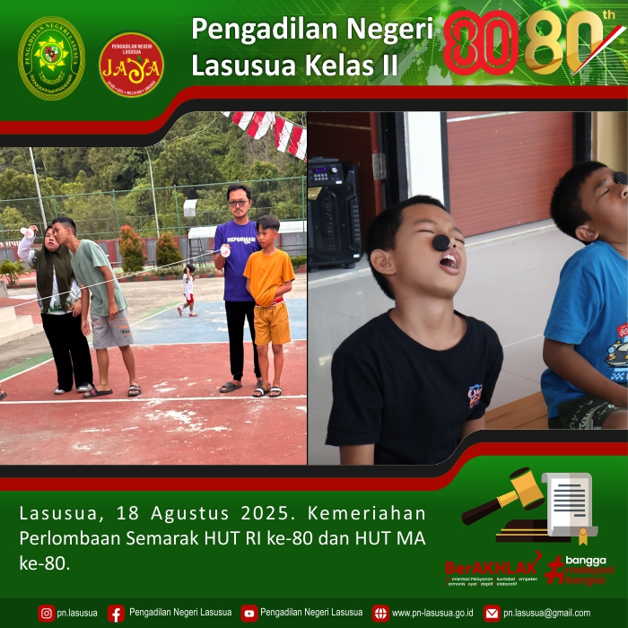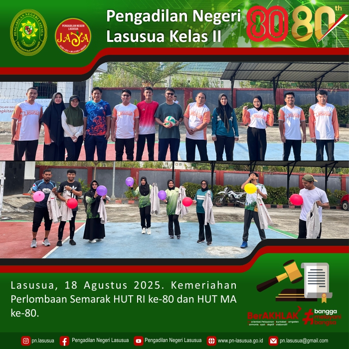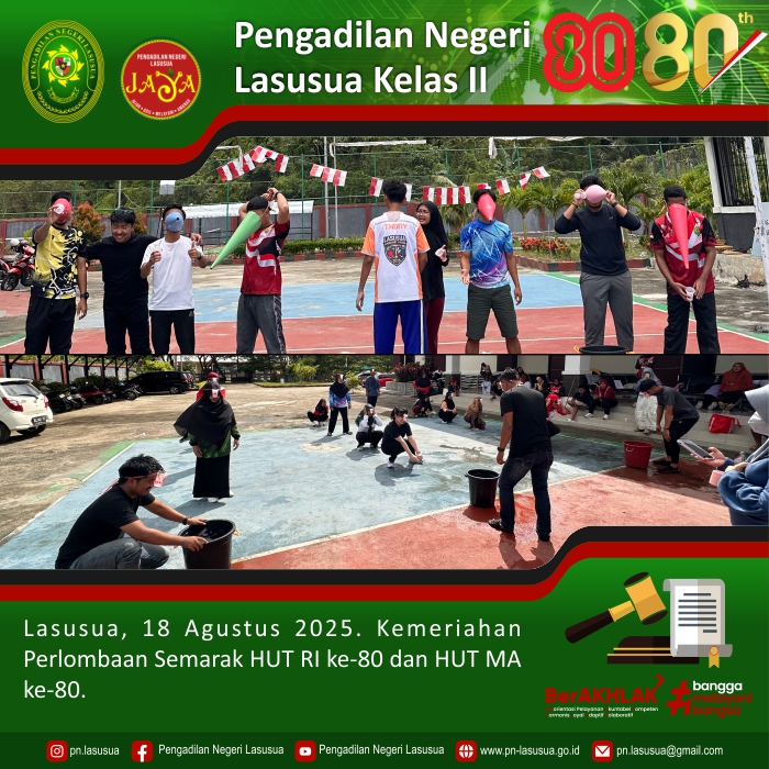Lasusua, 18 Agustus 2025 - Kegiatan Kemeriahan Perlombaan dalam rangka Hari Ulang Tahun Kemerdekaan Republik Indonesia ke-80 dan Hari Ulang Tahun Mahkamah Agung Republik Indonesia ke-80 yang diselenggarakan di Pengadilan Negeri Lasusua. Kegiatan di ikuti oleh keluarga besar Pengadilan Negeri Lasusua bersama Pengadilan Agama Lasusua yang dilaksanakan mulai tanggal 1 Agustus 2025 hingga 18 Agustus 2025.