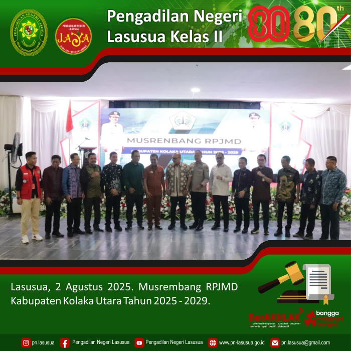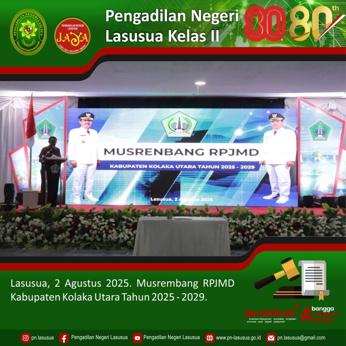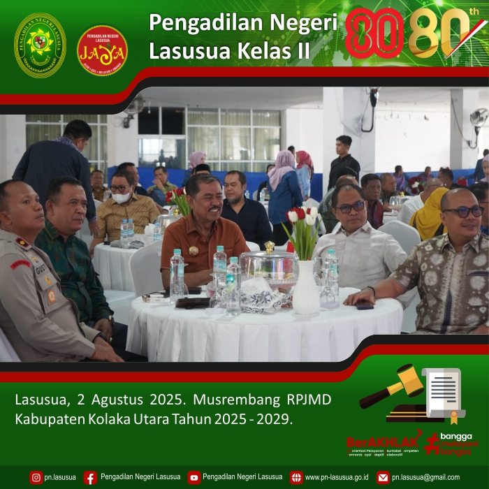 Lasusua, 2 Agustus 2025 - Ketua Pengadilan Negeri Lasusua Bapak Alfonsus Nahak, S.H., M.H. menghadiri Rapat Musrembang RPJMD Kabupaten Kolaka Utara Tahun 2025 - 2029 yang dilaksanakan di Kantor Bupati Kabupaten Kolaka Utara.