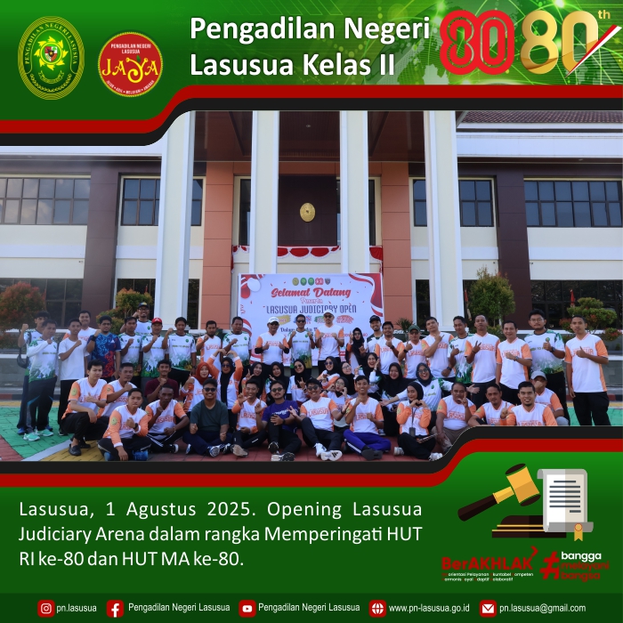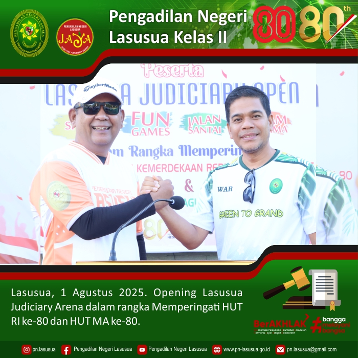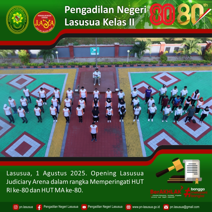 Lasusua, 1 Agustus 2025 - Bertempat di halaman depan Kantor Pengadilan Negeri Lasusua, dilaksanakan Kegiatan Opening Lasusua Judiciary Arena dalam rangka Memperingati Hari Ulang Tahun Kemerdekaan Republik Indonesia ke-80 dan Hari Ulang Tahun Mahkamah Agung RI ke-80. Lasusua Judiciary Arena merupakan agenda kolaboratif yang diselenggarakan bersama oleh PN Lasusua, Kolaka Utara, Sulawesi Tenggara dan PA Lasusua. Kegiatan ini menjadi wujud sinergi antar lembaga peradilan di wilayah Kabupaten Kolaka Utara dalam memperkuat semangat kebangsaan, kebersamaan, serta integritas di lingkungan peradilan.