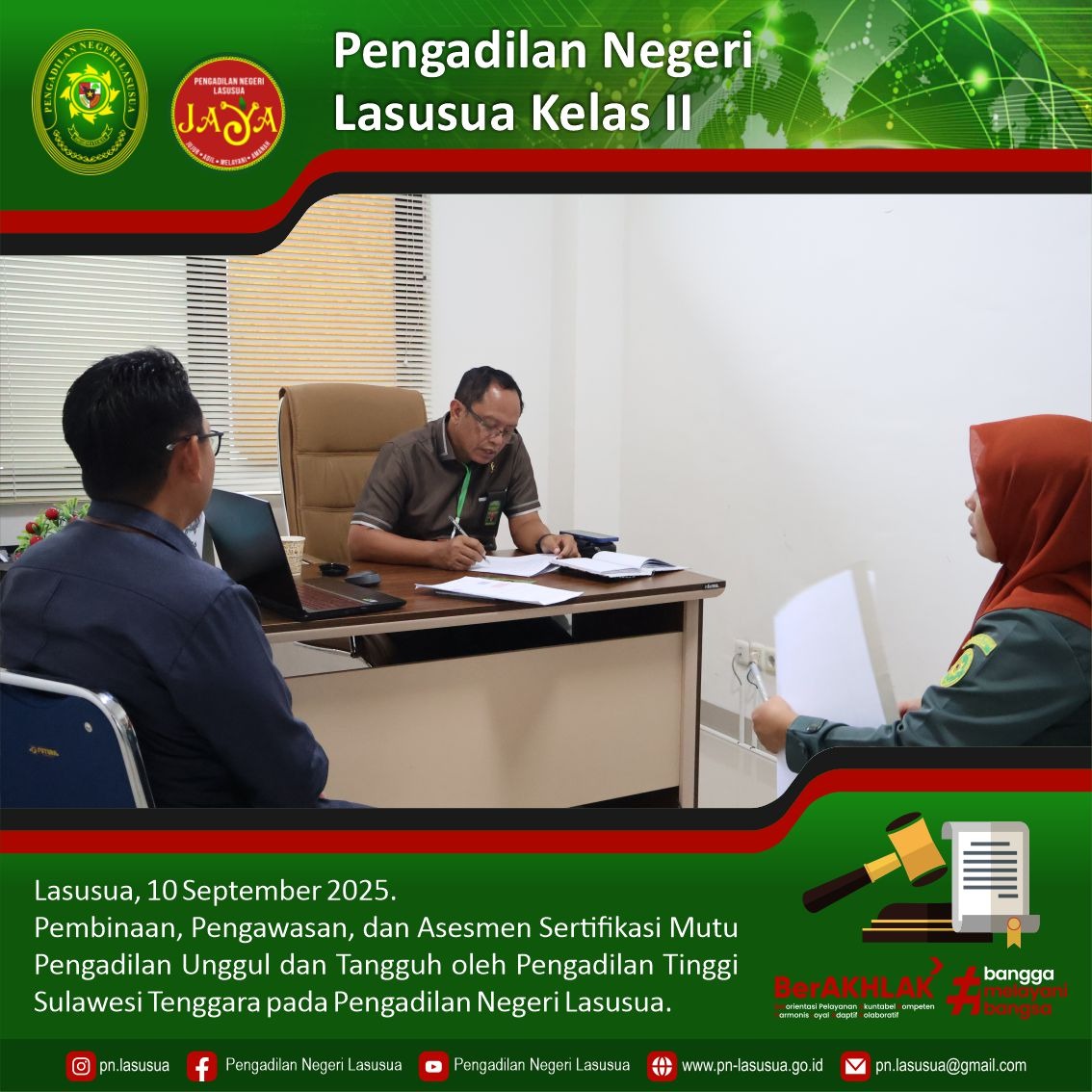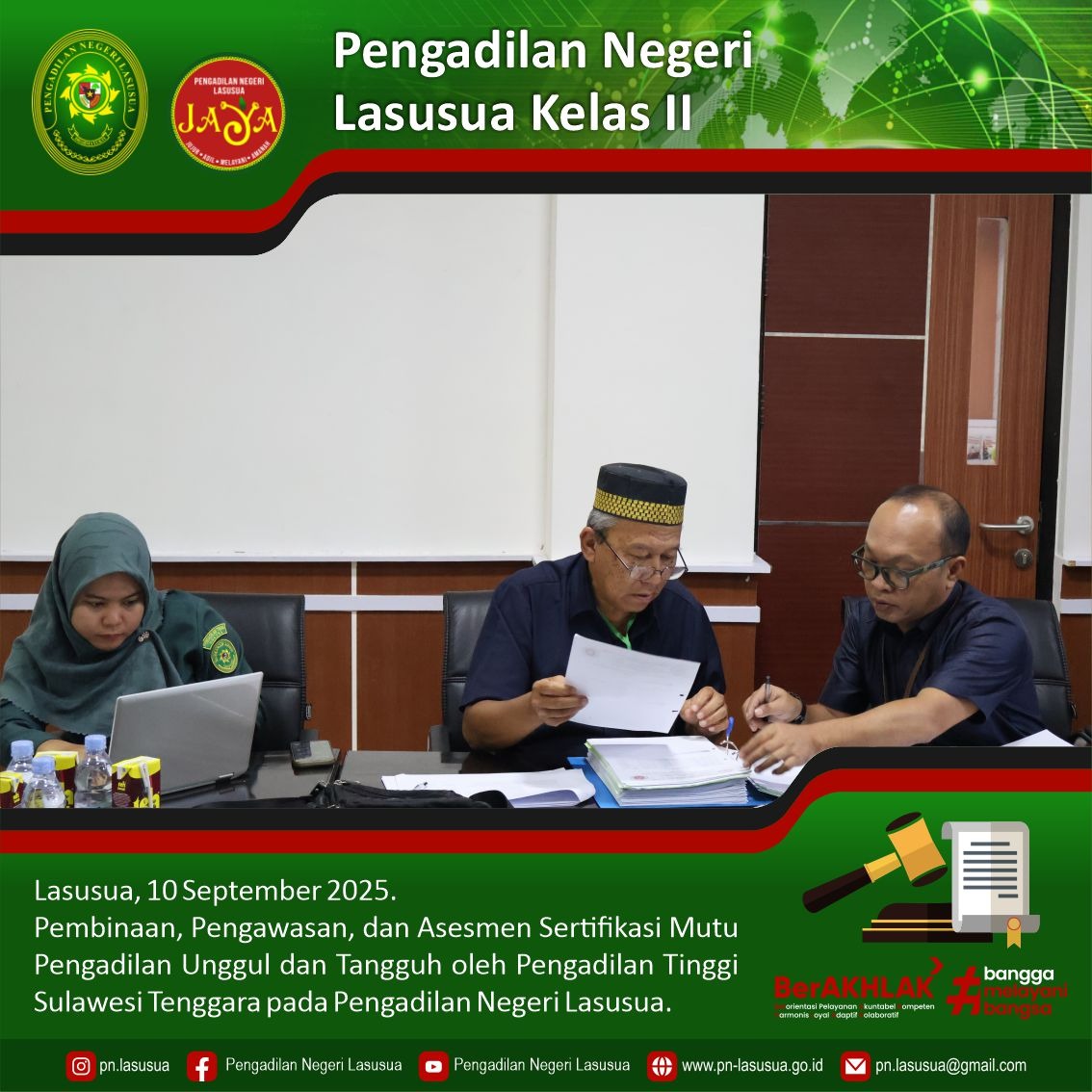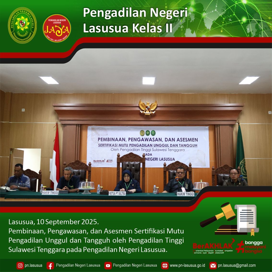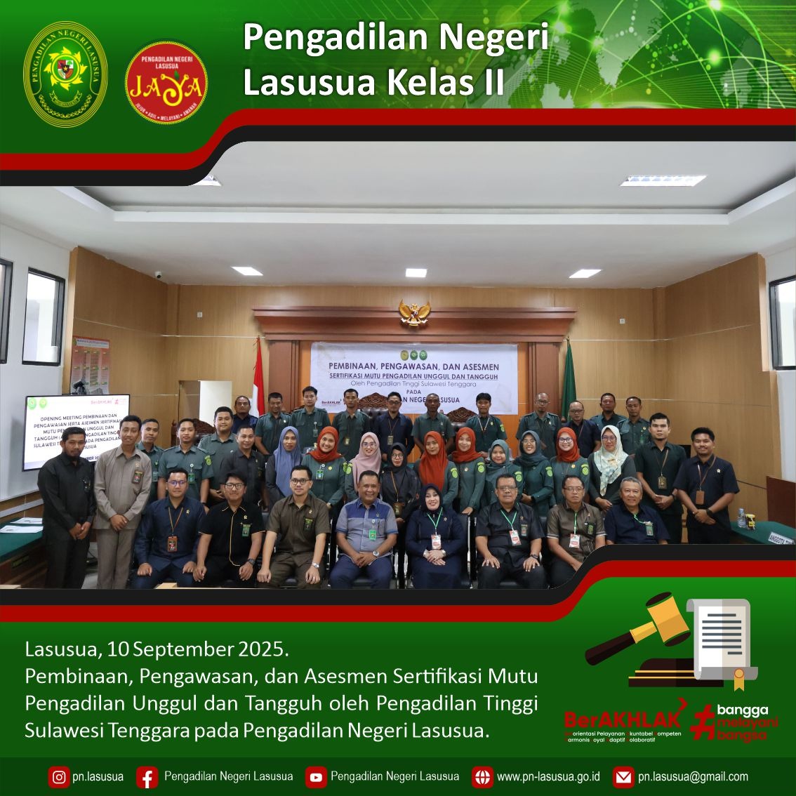 Lasusua, 10 September 2025 - Kegiatan Opening Meeting, Pembinaan, Pengawasan, dan Asesmen Sertifikasi Mutu Pengadilan Unggul dan Tangguh oleh Pengadilan Tinggi Sulawesi Tenggara pada Pengadilan Negeri Lasusua yang dipimpin langsung Oleh YM. Ketua PengadilanTinggiSulawesiTenggara.