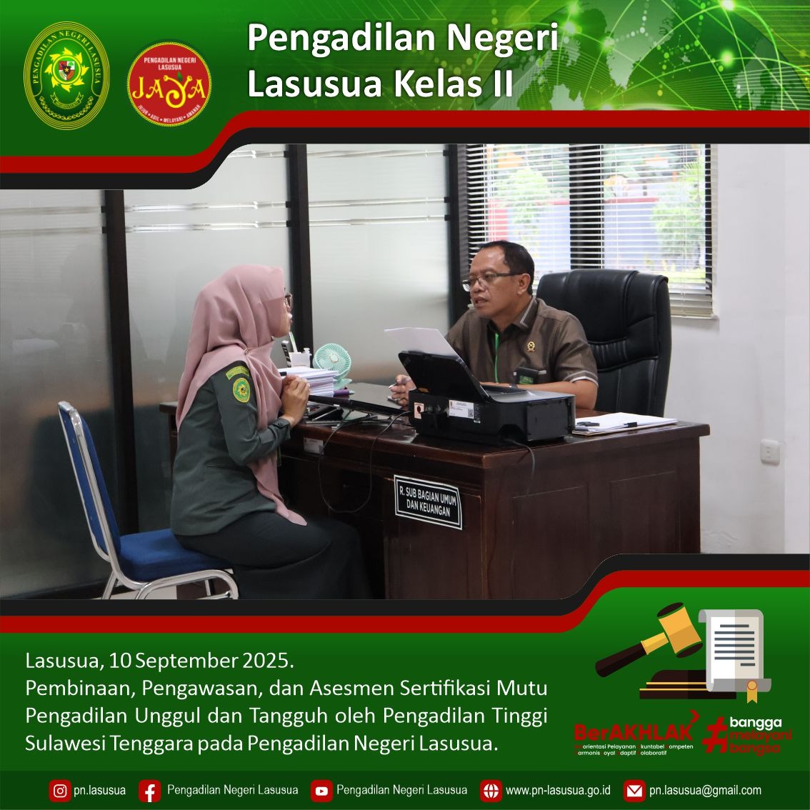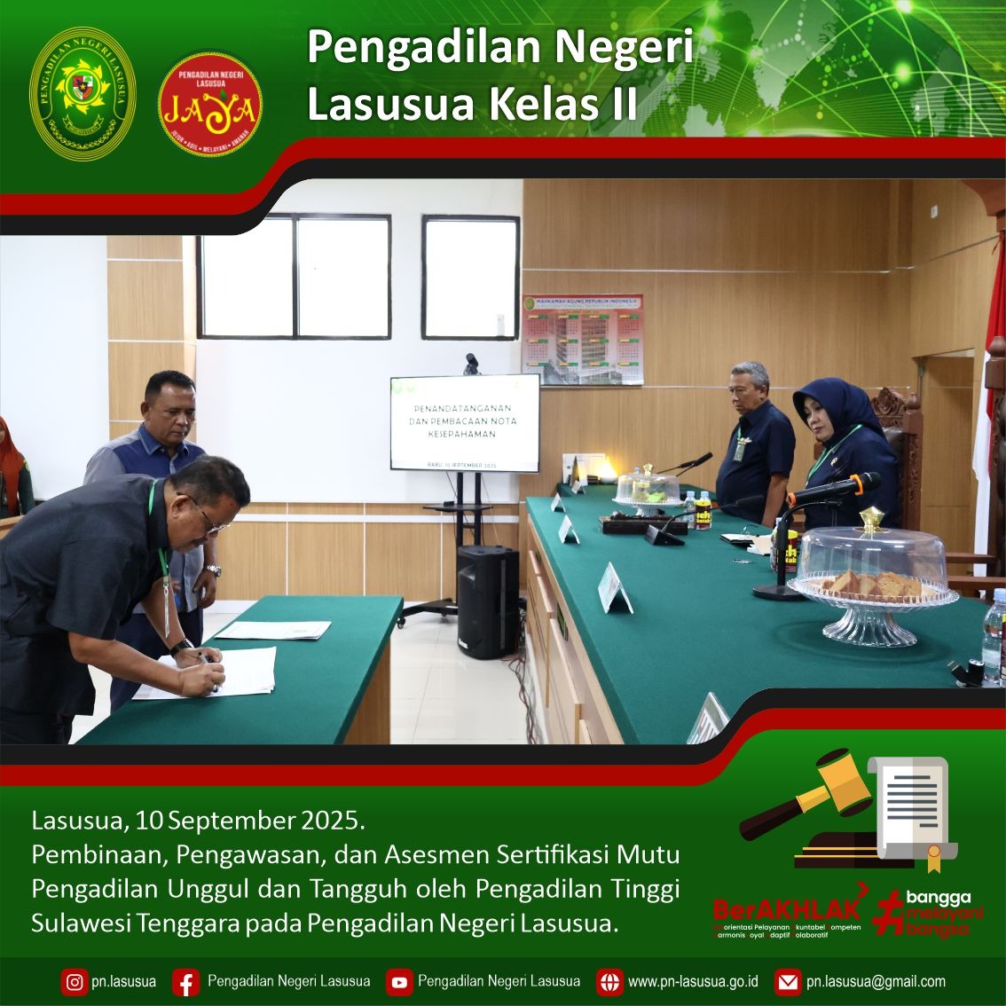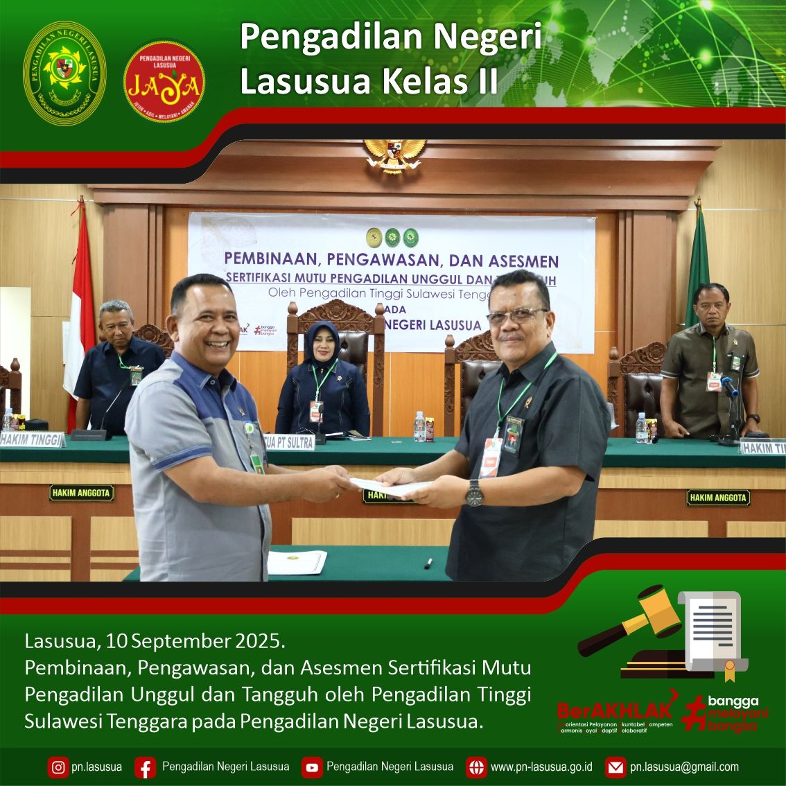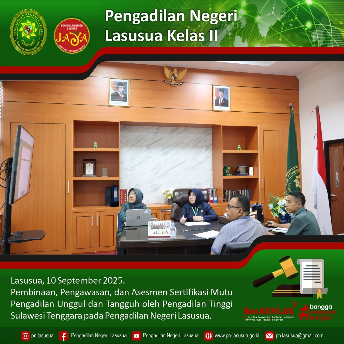 Lasusua, 10 September 2025 - Kegiatan Opening Meeting, Pembinaan, Pengawasan, dan Asesmen Sertifikasi Mutu Pengadilan Unggul dan Tangguh oleh Pengadilan Tinggi Sulawesi Tenggara pada Pengadilan Negeri Lasusua yang dipimpin langsung Oleh YM. Ketua PengadilanTinggiSulawesiTenggara.
