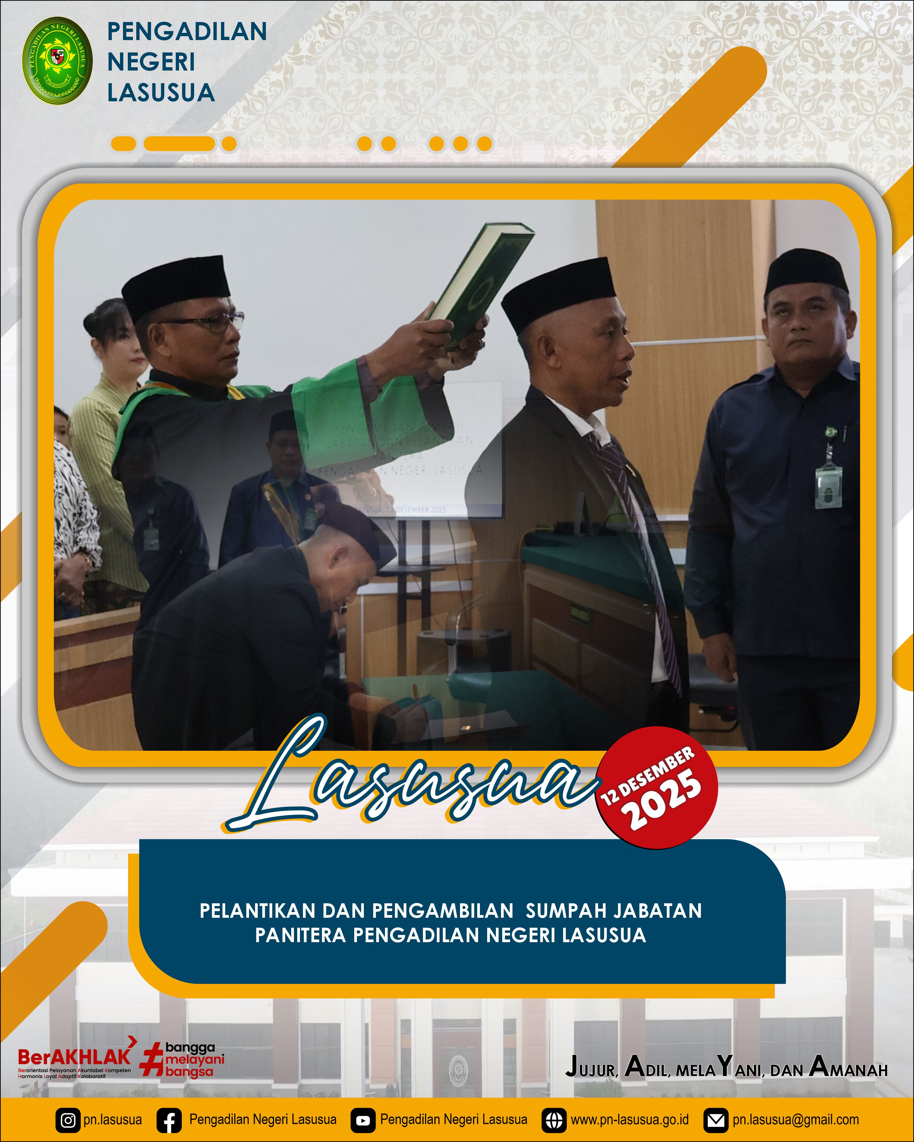 Lasusua, 12 Desember 2025 - Bertempat di Ruang Sidang Pengadilan Negeri Lasusua, telah dilaksanakan Pelantikan dan Pengambilan Sumpah Jabatan Panitera Pengadilan Negeri Lasusua atas nama ENTENG, S.H.