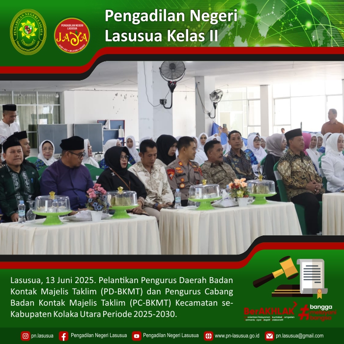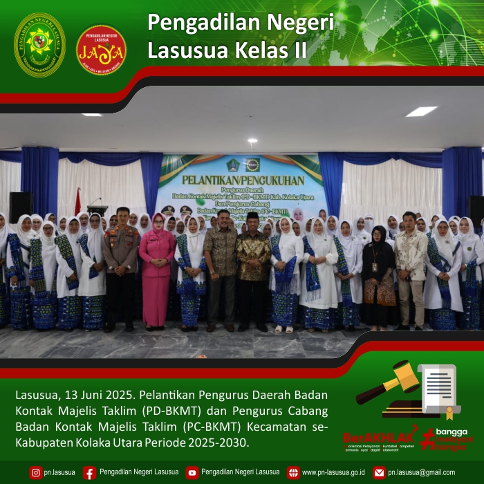 Lasusua, 13 Juni 2025 - Panitera Pengadilan Negeri Lasusua Ibu Munawarah, S.H. menghadiri Pelantikan Pengurus Daerah Badan Kontak Majelis Taklim (PD-BKMT) Kabupaten Kolaka Utara dan Pengurus Cabang Badan Kontak Majelis Taklim (PC-BKMT) Kecamatan se-Kabupaten Kolaka Utara Periode 2025-2030 yang dilaksanakan di Masjid Agung Kabupaten Kolaka Utara.