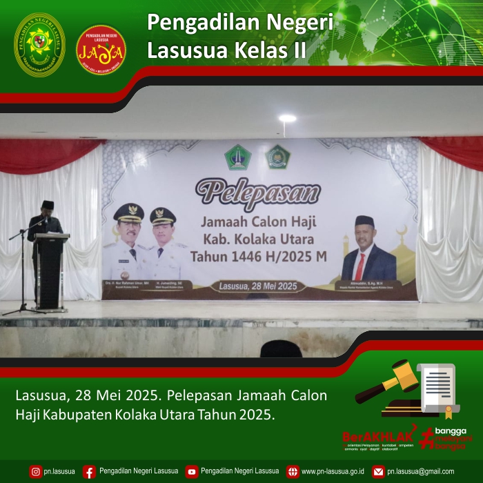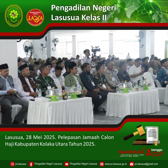 Lasusua, 28 Mei 2025 - Sekretaris Pengadilan Negeri Lasusua Bapak Aswar Asmir, S.Kom. menghadiri Pelepasan Calon Jamaah Haji Kabupaten Kolaka Utara Tahun 2025 yang dilaksanakan di Aula Masjid Agung Kabupaten Kolaka Utara.