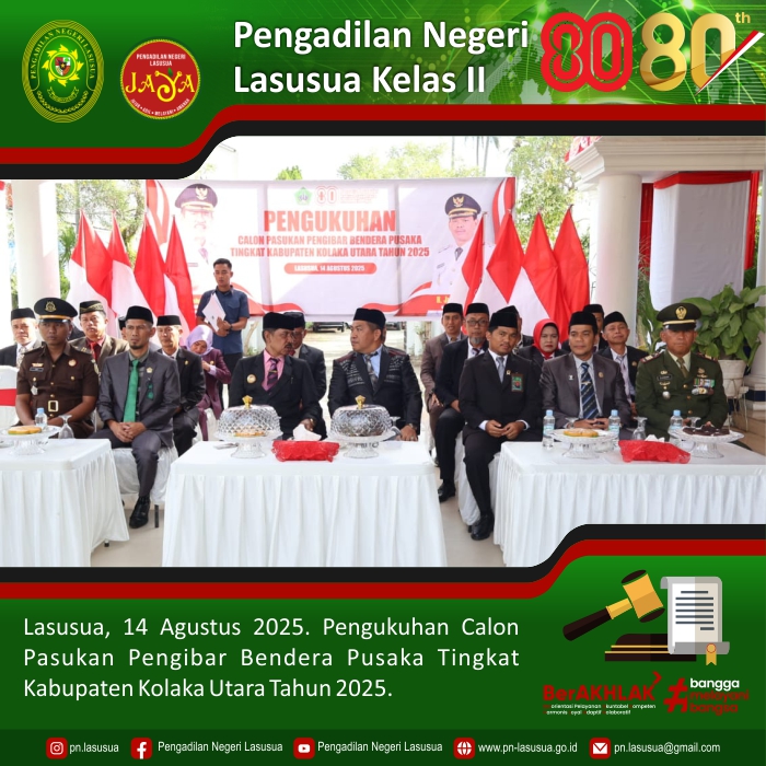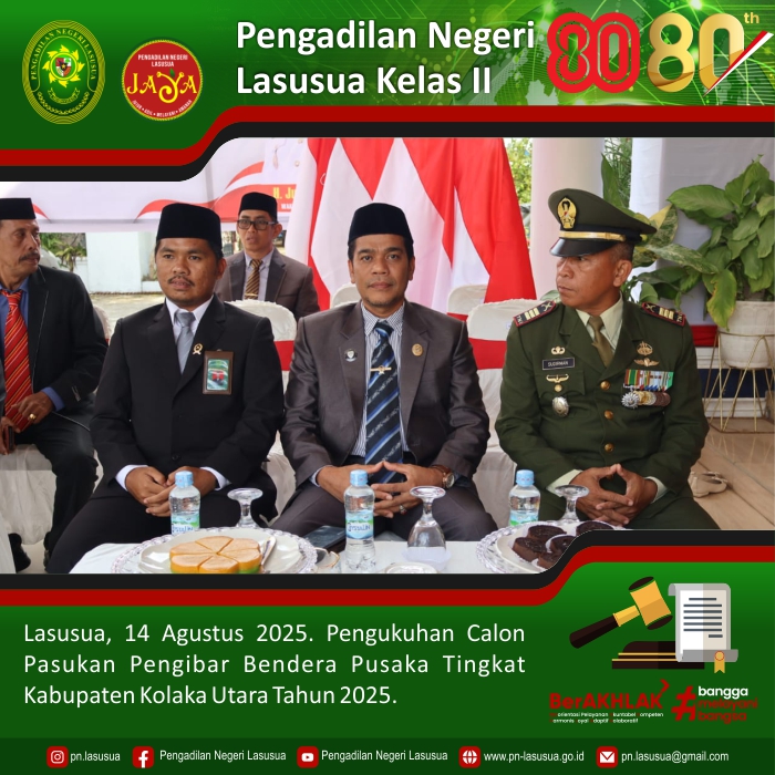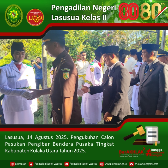 Lasusua, 14 Agustus 2025 - Hakim Pengadilan Negeri Lasusua Bapak Aditya Darmawan, S.H. menghadiri Pengukuhan Calon Pasukan Pengibar Bendera Pusaka Tingkat Kabupaten Kolaka Utara Tahun 2025 yang dilaksanakan di Lapangan Aspirasi Kabupaten Kolaka Utara.