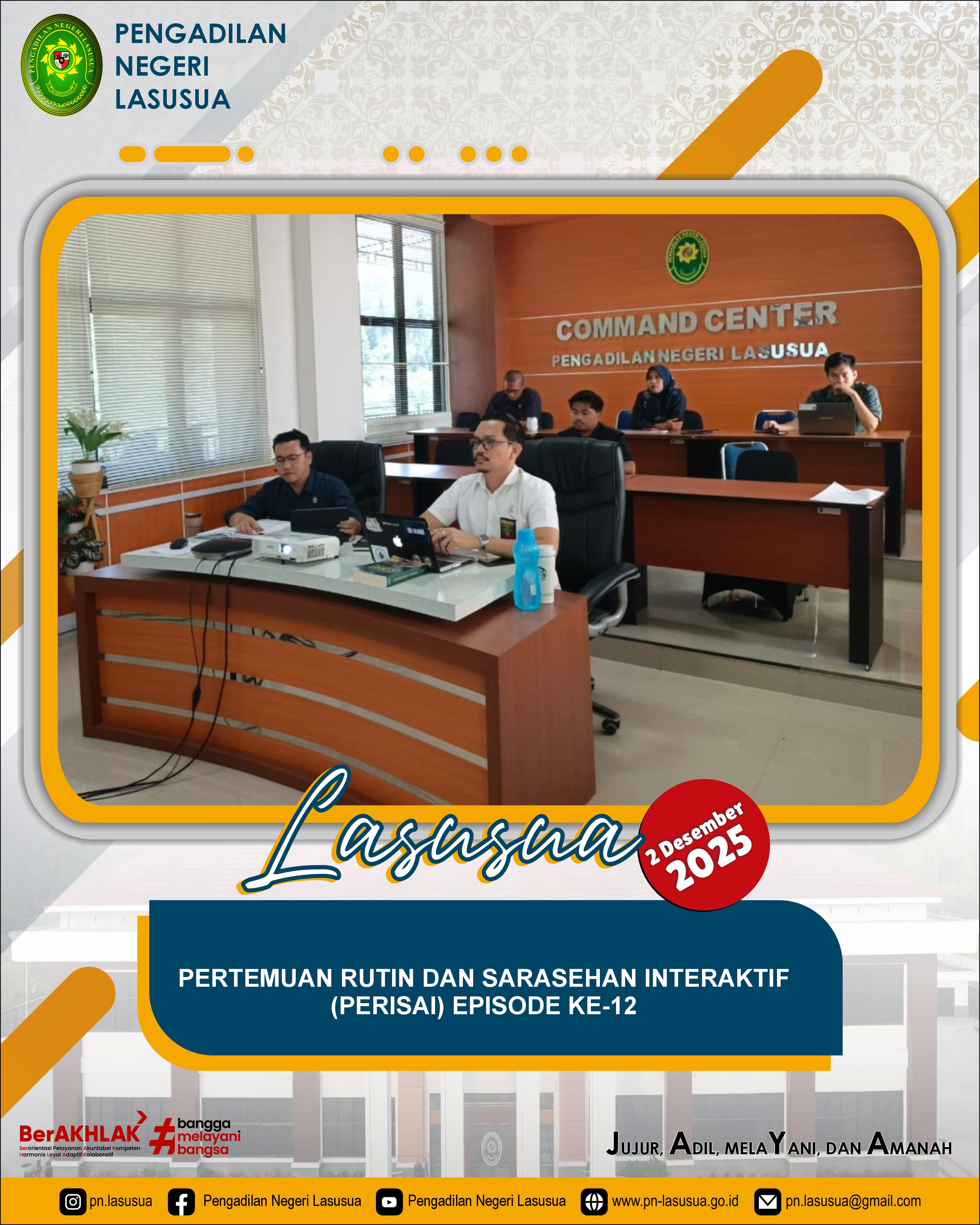 Lasusua, 2 Desember 2025 - Bertempat di Ruangan Command Center Pengadilan Negeri Lasusua dilaksanakan Pertemuan Rutin dan Sarasehan Interaktif (PERISAI) Episode ke-12 dengan Topik Tinjauan Pembaharuan KUHAP “Das Sollen Peran Pengadilan dalam sistem peradilan pidana” dilakukan secara daring dan diikuti oleh Hakim, Panitera, Panitera Muda, Jurusita, dan Staf Kepaniteraan.