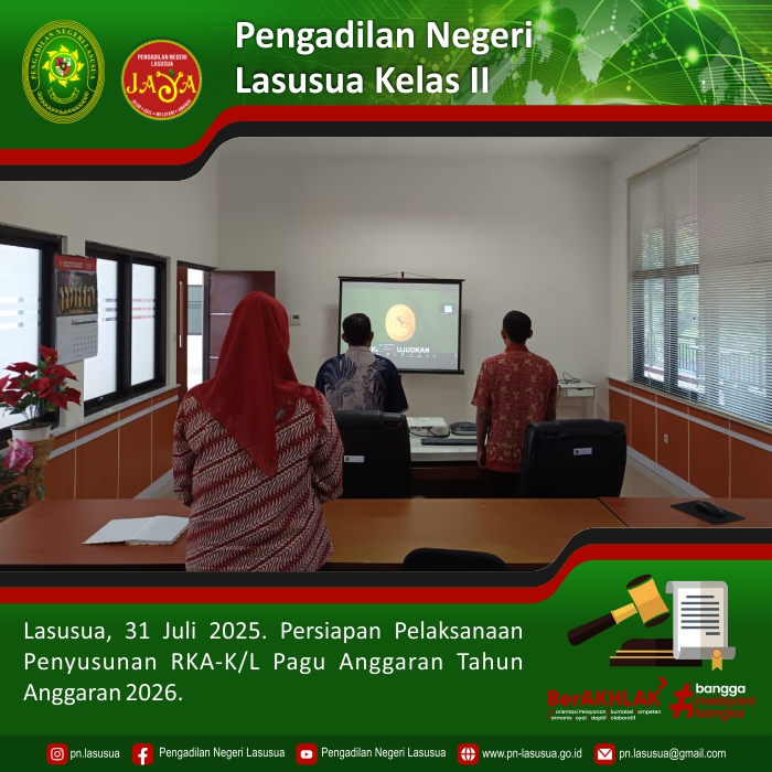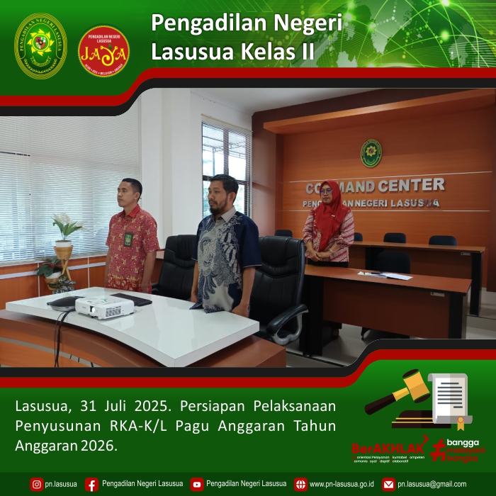 Lasusua, 31 Juli 2025 - Bertempat di Ruang Command Center Pengadilan Negeri Lasusua dilaksanakan Persiapan Pelaksanaan Penyusunan RKA-K/L Pagu Anggaran Tahun Anggaran 2026 secara daring di ikuti oleh Sekretaris, Kasubag PTIP dan Staf PTIP Pengadilan Negeri Lasusua.