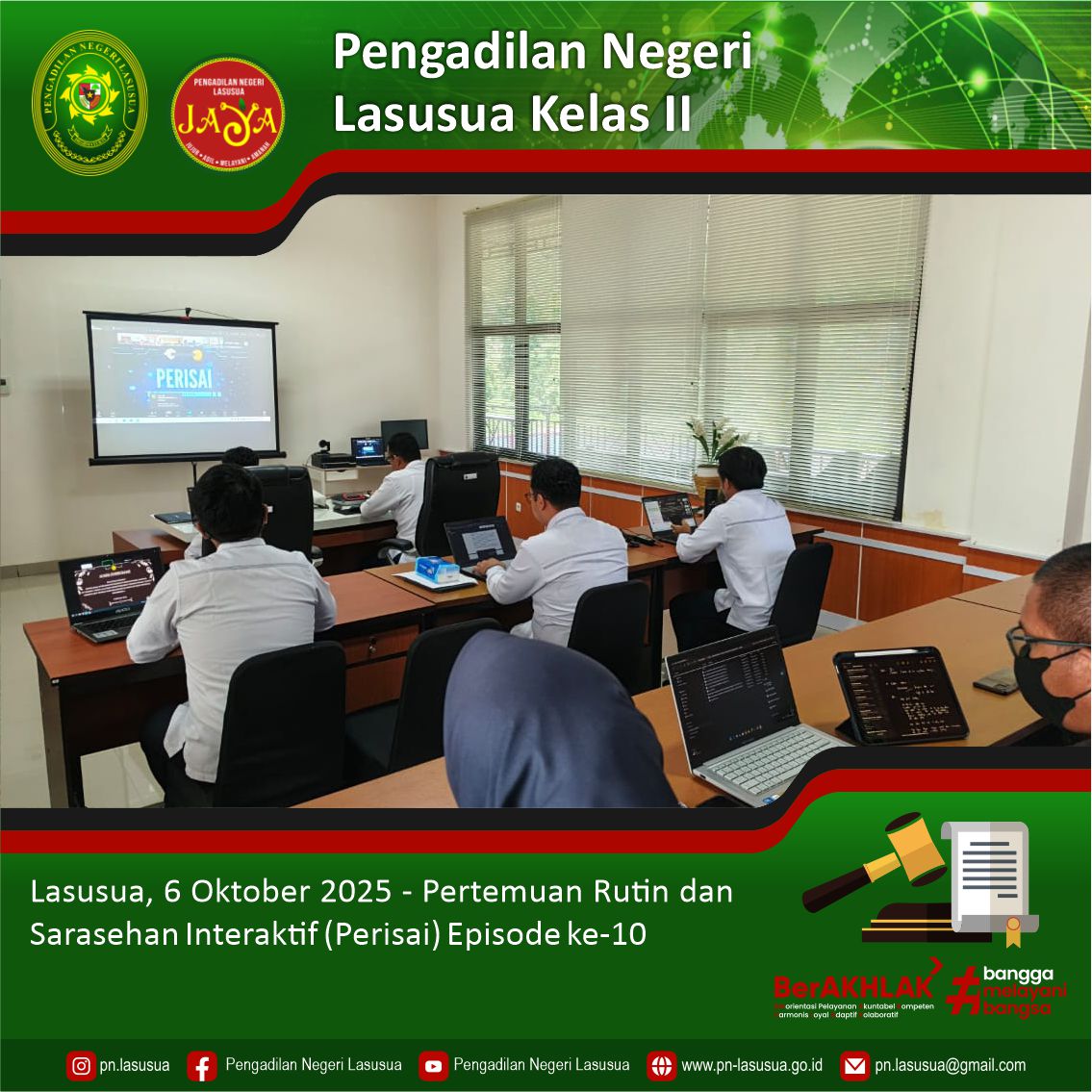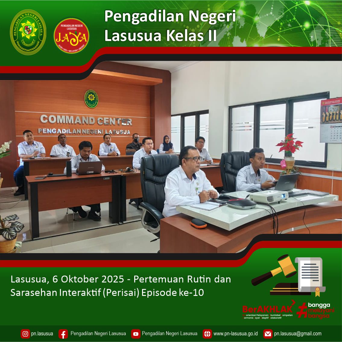 Lasusua, 6 Oktober 2025 - Bertempat di Ruang Command Center Pengadilan Negeri Lasusua dilaksanakan Pertemuan Rutin dan Sarasehan Interaktif Badan Peradilan Umum (Perisai Badilum) Episode ke-10 secara daring yang di ikuti Ketua Pengadilan Negeri Lasusua, Para Hakim, Para Panmud, Panitera Pengganti, dan Jurusita, serta Staf Kepaniteraan Pengadilan Negeri Lasusua. Tema Mengurai Kompleksitas Esekusi Perdata “ Problematika, Solusi dan Prospek Pembaruan Hukum"