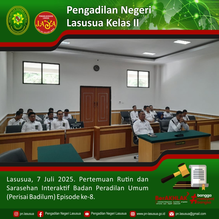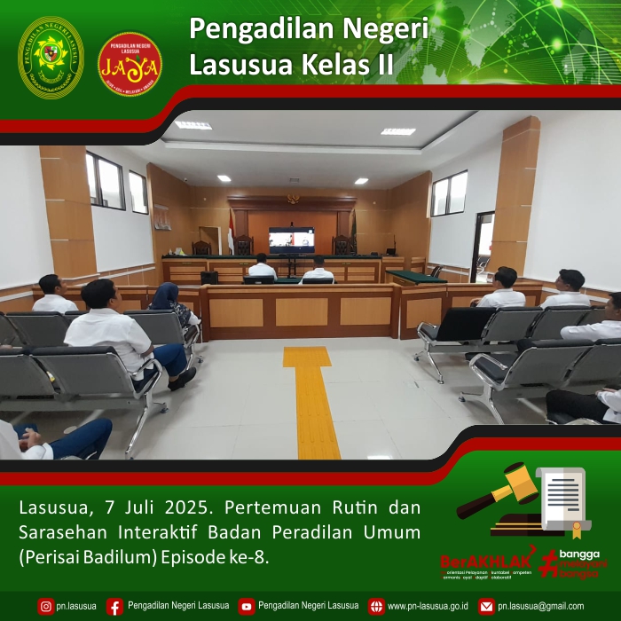 Lasusua, 7 Juli 2025 - Bertempat di Ruang Sidang Utama Pengadilan Negeri Lasusua dilaksanakan Pertemuan Rutin dan Sarasehan Interaktif Badan Peradilan Umum (Perisai Badilum) Episode ke-8 dengan tema "Juru Bicara Pengadilan Ujung Tombak Informasi Keadilan" secara daring yang di ikuti Ketua Pengadilan Negeri Lasusua, Para Hakim, Panitera, Sekretaris,Para Panmud, Panitera Pengganti, dan Jurusita Serta Staf Kepaniteraan Pengadilan Negeri Lasusua.