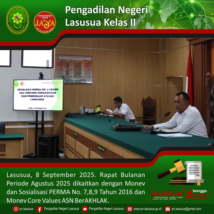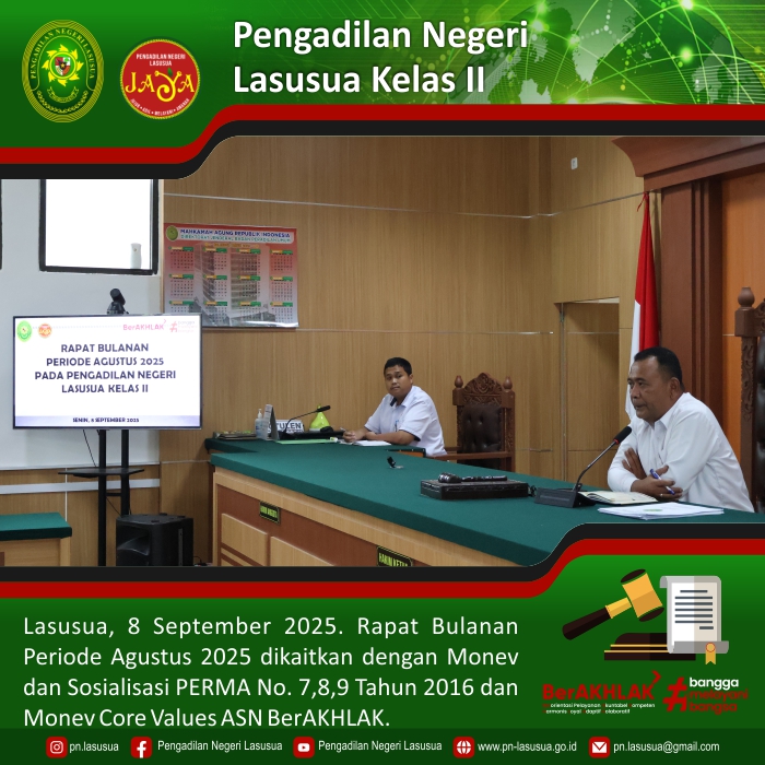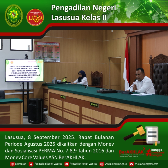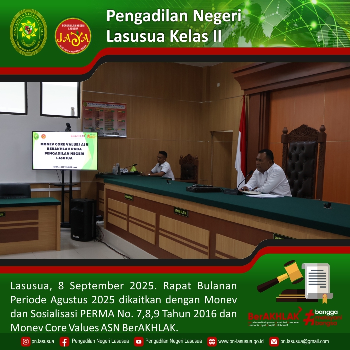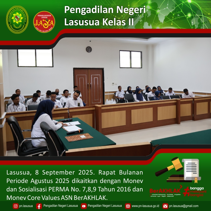 Lasusua, 8 September 2025 - Bertempat diruang sidang Utama Pengadilan Negeri Lasusua telah dilaksanakan Kegiatan Rapat Bulanan Periode Agustus 2025. Kegiatan dipimpin langsung oleh Ketua Pengadilan Negeri Lasusua yang diikuti oleh seluruh hakim, pegawai dan P3K Pengadilan Negeri Lasusua.