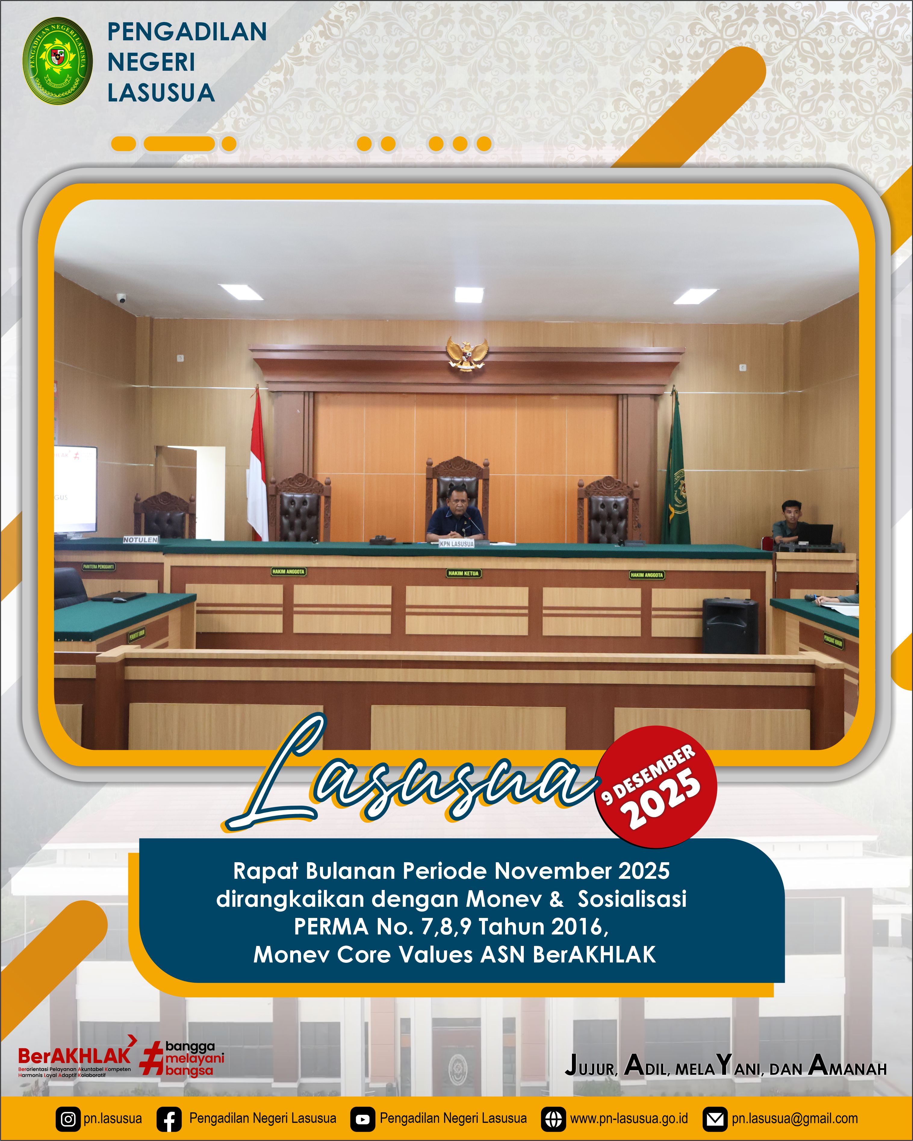 Lasusua, 9 Desember 2025 - Bertempat di ruang sidang utama, telah dilaksanakan Rapat Bulanan Periode November 2025, dirangkaikan dengan Monev & Sosialisasi PERMA No. 7, 8, 9 Tahun 2016, dan Monev Core Values ASN BerAKHLAK. Kegiatan ini adalah kegiatan rutin bulanan yangdiikuti oleh seluruh Aparatur Pengadilan Negeri Lasusua yang bertujuan untuk merefleksi kinerja sebulan berjalan dan merencanakan kinerja sebulan kedepan dan juga untuk memaksimalkan kinerja dalam melayani para pencari keadilan.#ditjenbadilum