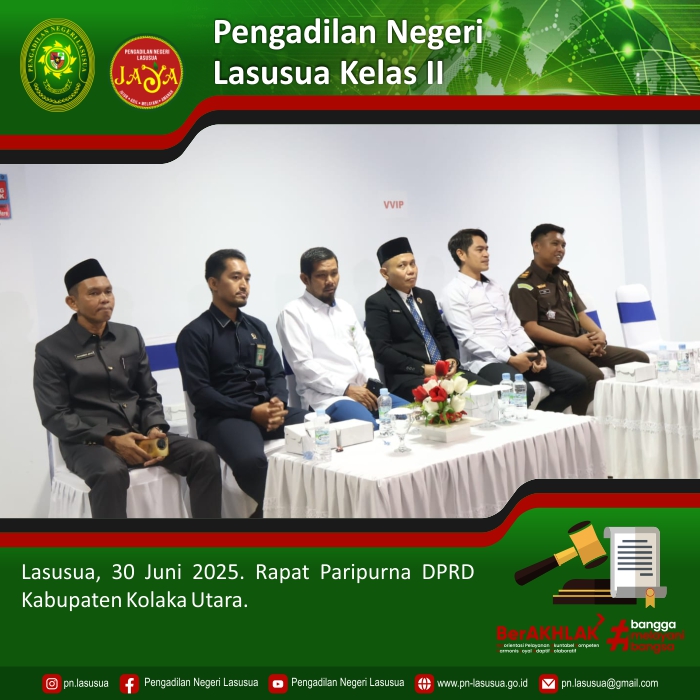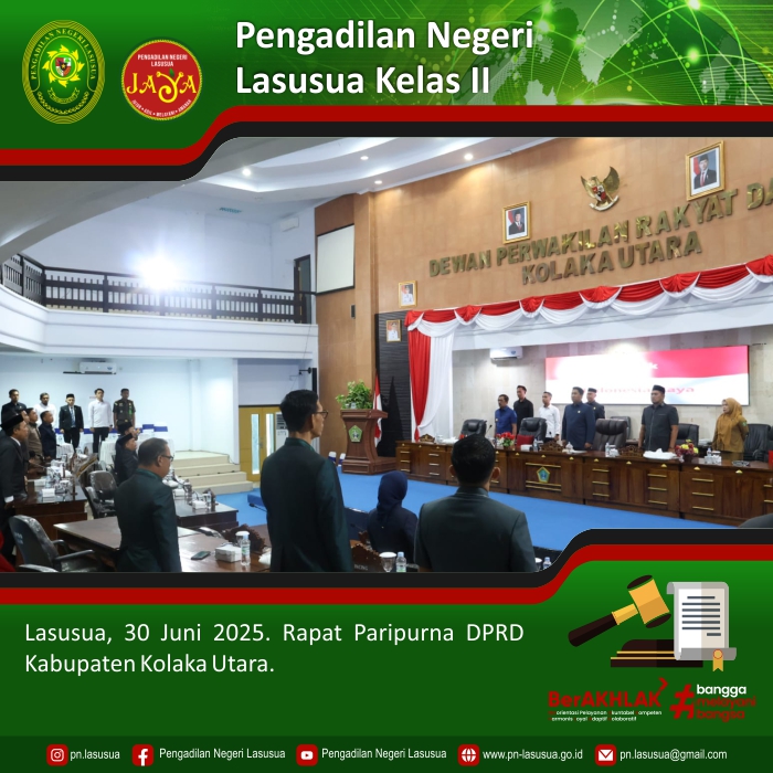 Lasusua, 30 Juni 2025 - Sekretaris Pengadilan Negeri Lasusua Bapak Aswar Asmir, S.Kom. menghadiri Rapat Paripurna DPRD Kabupaten Kolaka Utara yang dilaksanakan di DPRD Kababupaten Kolaka Utara.