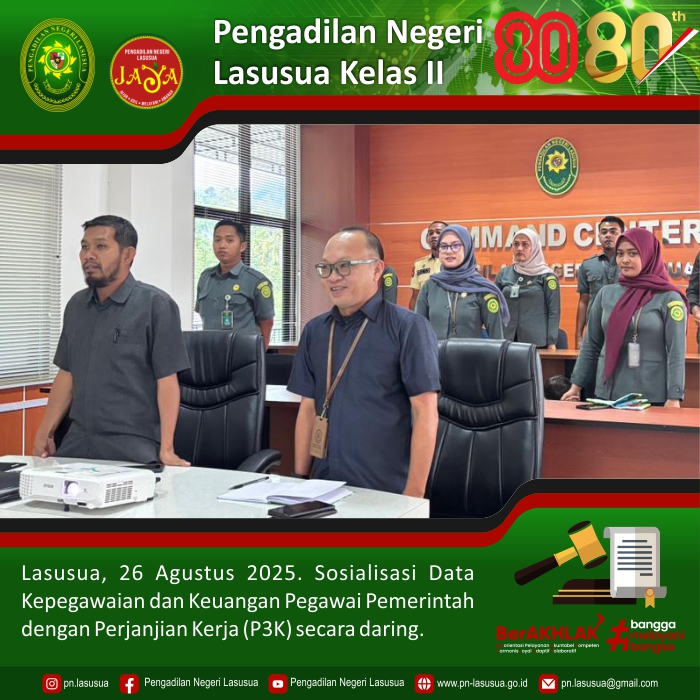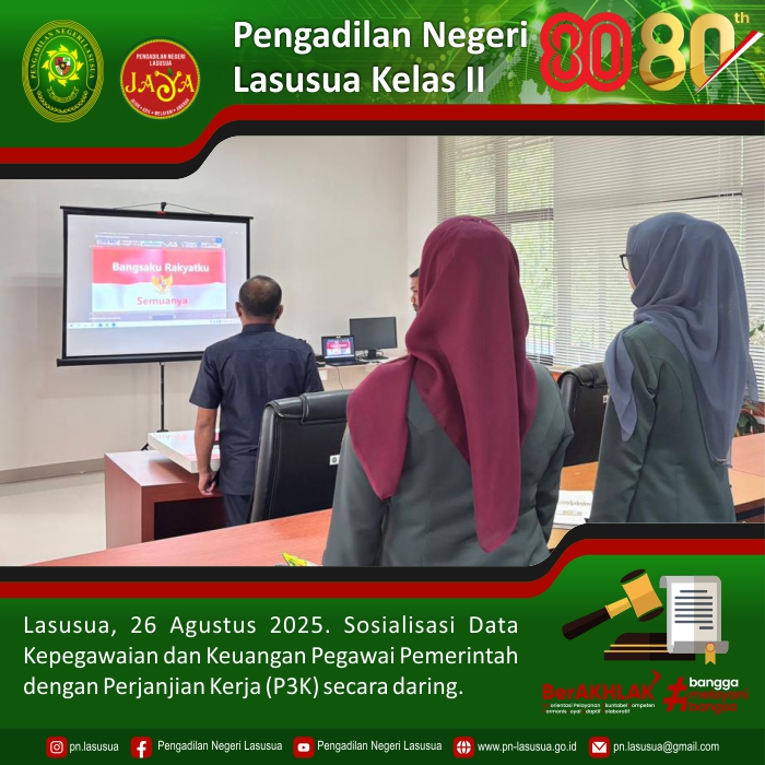 Lasusua, 26 Agustus 2025 - Bertempat di Ruang Command Center Pengadilan Negeri Lasusua dilaksanakan Sosialisasi Data Kepegawaian dan Keuangan Pegawai Pemerintah dengan Perjanjian Kerja (P3K) secara daring di ikuti oleh Sekretaris, Kasbag Kepegawaian, Kasubag Umum dan Keuangan, Staf Kepegawaian dan Keuangan, serta para calon PPPK Pengadilan Negeri Lasusua.