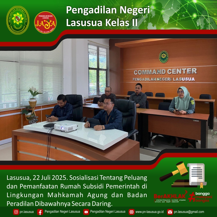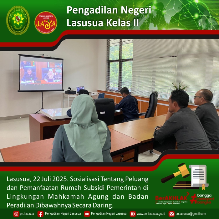 Lasusua, 22 Juli 2025 - Bertempat di Ruang Command Center Pengadilan Negeri Lasusua dilaksanakan Sosialisasi Tentang Peluang dan Pemanfaatan Rumah Subsidi Pemerintah di Lingkungan Mahkamah Agung dan Badan Peradilan Dibawahnya Secara Daring di ikuti oleh Hakim, Sekretaris, Para Kasubbag PTIP Pengadilan Negeri Lasusua.