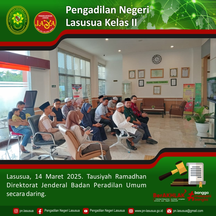 Lasusua, 14 Maret 2025 - Bertempat di Ruang PTSP Pengadilan Negeri Lasusua dilaksanakan Tausiyah Ramadhan Direktorat Jenderal Badan Peradilan Umum secara daring denga penceramah yaitu Ustadz Dr. (H.C) Adi Hidayat, Lc., M.A. yang di ikuti Ketua, para hakim, sekretaris, para panmud dan kasubbag, pejabat fungsional, dan staf Pengadilan Negeri Lasusua.