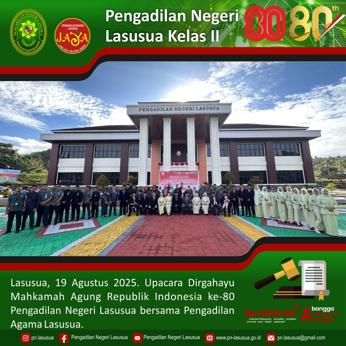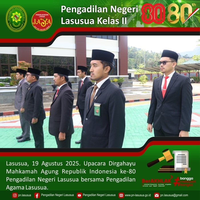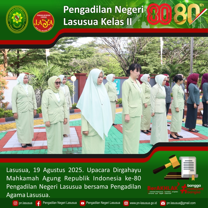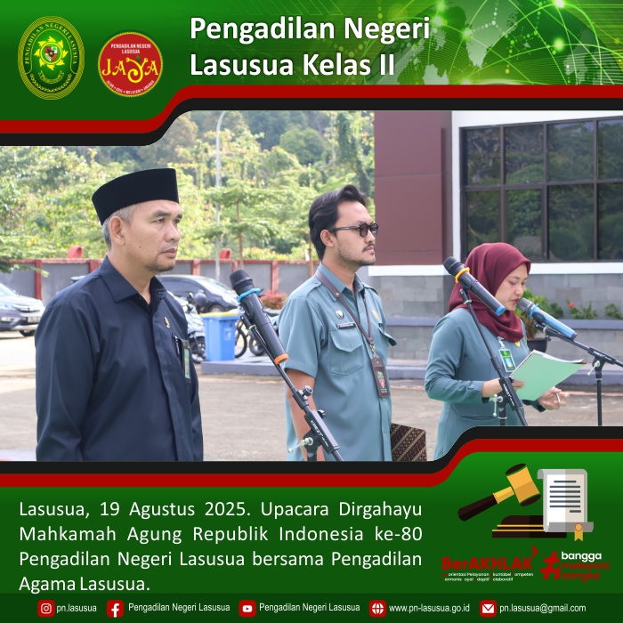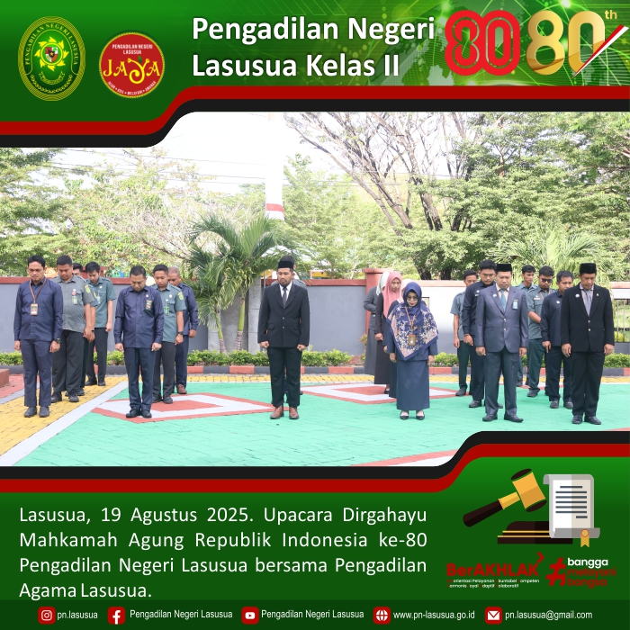 Lasusua, 19 Agustus 2025 - Kegiatan Upacara dalam Rangka Dirgahayu Mahkamah Agung Republik Indonesia ke-80 dengan tema "Pengadilan Bermartabat, Negara Berdaulat". Upacara dipimpin oleh Ketua Pengadilan Negeri Lasusua Bapak Alfonsus Nahak, S.H., M.H. Peserta Upacara di ikuti oleh Seluruh Hakim dan Pegawai Pengadilan Negeri Lasusua dan Pengadilan Agama Lasusua yang dilaksanakan di Halaman Kantor Pengadilan Negeri Lasusua.
