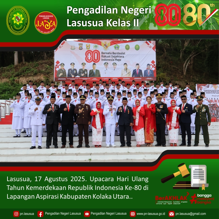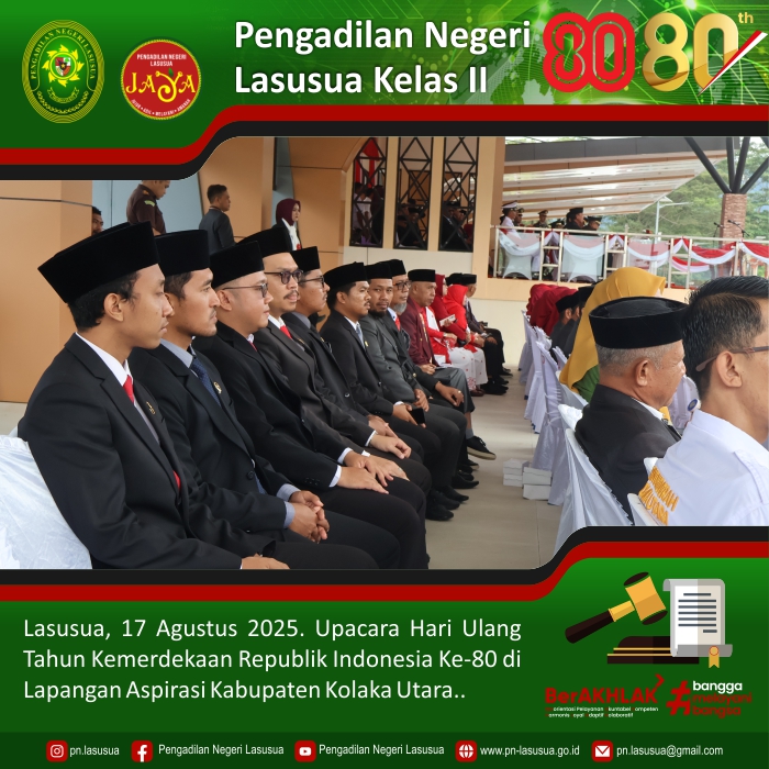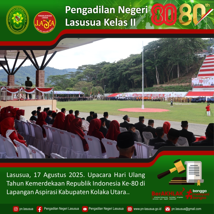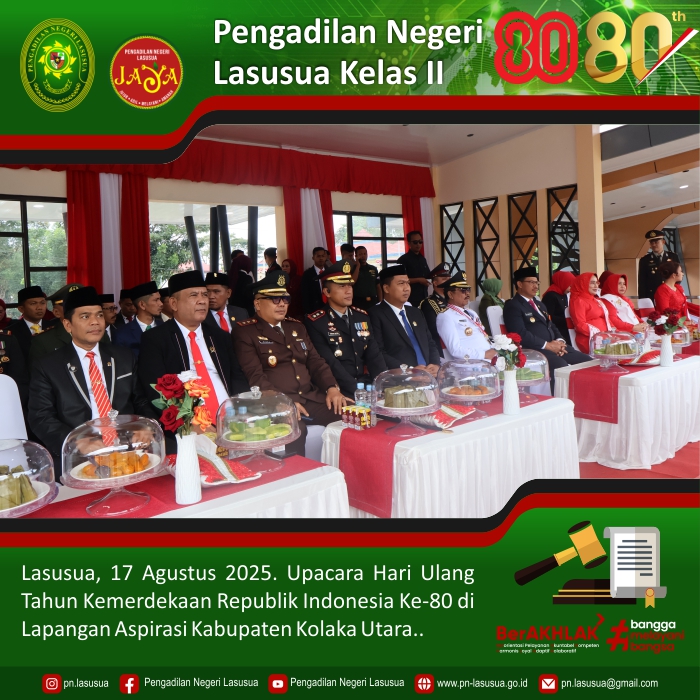 Lasusua, 17 Agustus 2025 - Kegiatan Upacara Pengibaran Bendera dalam Rangka Hari Ulang Tahun Kemerdekaan Republik Indonesia ke-80 dengan tema "Berdatu Berdaulat, Rakyat Sejahtera, Indonesia Maju" yang dilaksanakan di Lapangan Aspirasi Pemerintah Kabupaten Kolaka Utara yang di ikuti oleh Ketua, Para Hakim, Panitera dan Sekretaris Pengadilan Negeri Lasusua.