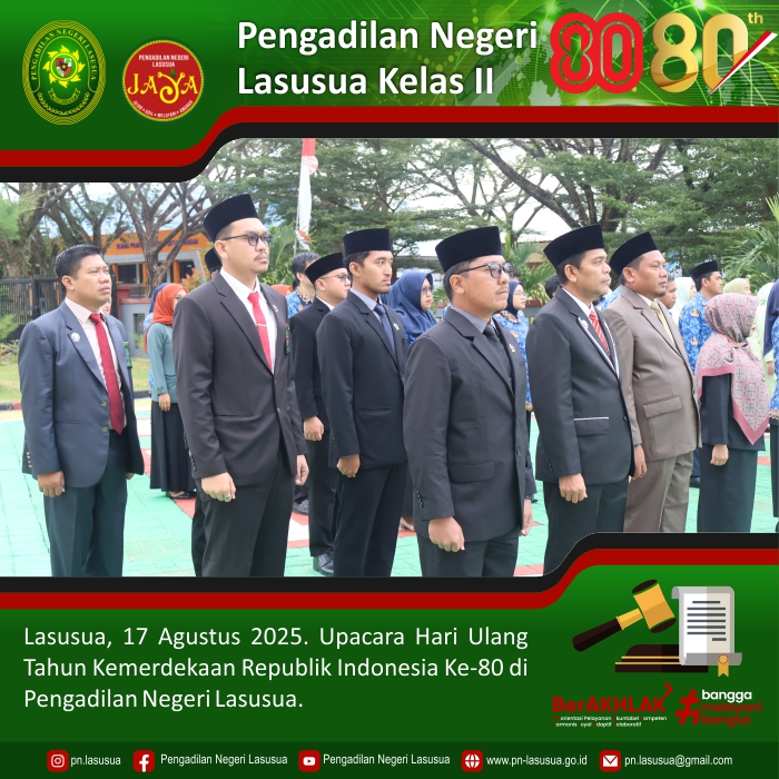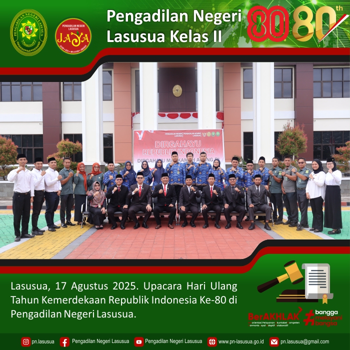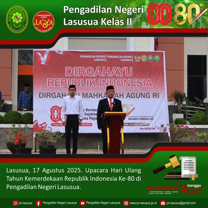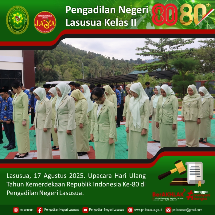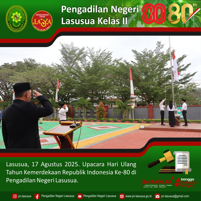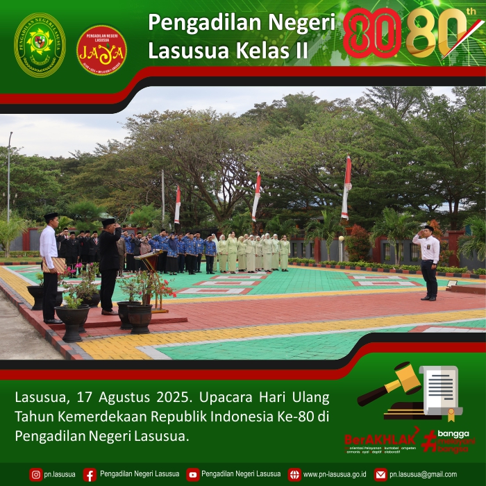 Lasusua, 17 Agustus 2025 - Kegiatan Upacara Pengibaran Bendera dalam Rangka Hari Ulang Tahun Kemerdekaan Republik Indonesia ke-80 dengan tema "Berdatu Berdaulat, Rakyat Sejahtera, Indonesia Maju". Upacara dipimpin oleh Ketua Pengadilan Negeri Lasusua Bapak Alfonsus Nahak, S.H., M.H. Peserta Upacara di ikuti oleh Seluruh Hakim dan Pegawai Pengadilan Negeri Lasusua dan Pengadilan Agama Lasusua yang dilaksanakan di Halaman Kantor Pengadilan Negeri Lasusua.