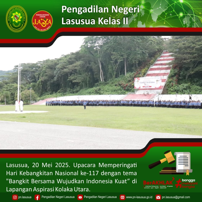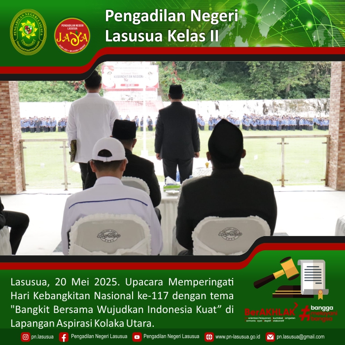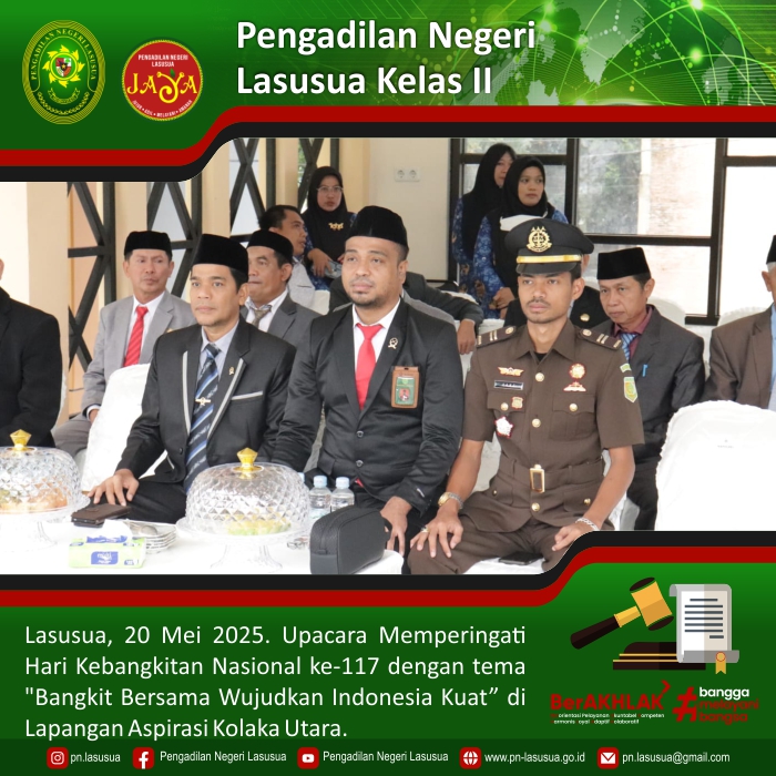 Lasusua, 20 Mei 2025 - Hakim Pengadilan Negeri Lasusua Bapak La Rusman, S.H. menghadiri Upacara Memperingati Hari Kebangkitan Nasional ke-117 dengan tema "Bangkit Bersama Wujudkan Indonesia Kuat" yang dilaksanakan di Lapangan Aspirasi Kabupaten Kolaka Utara.