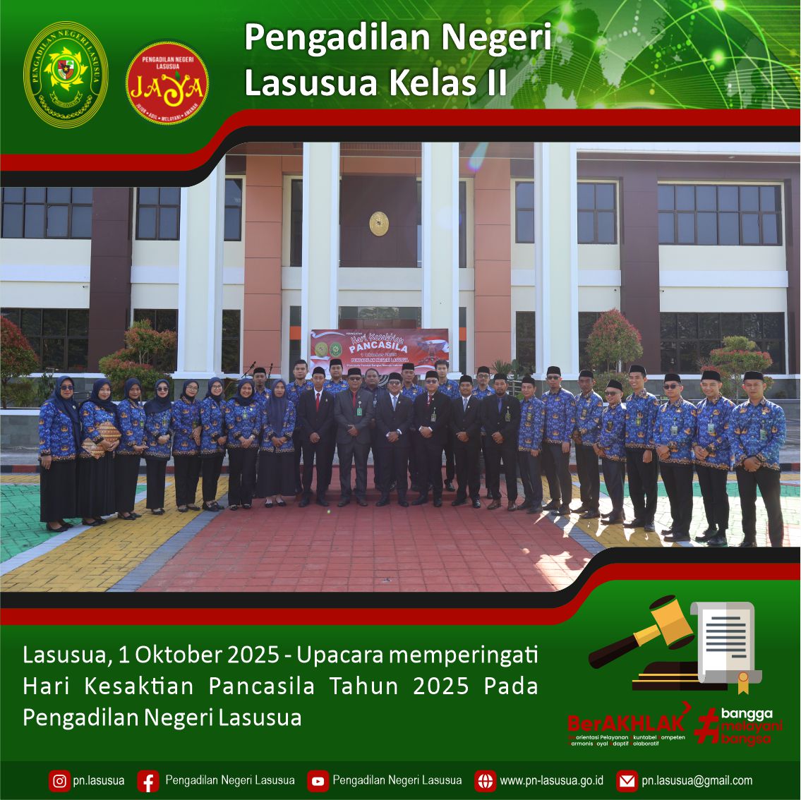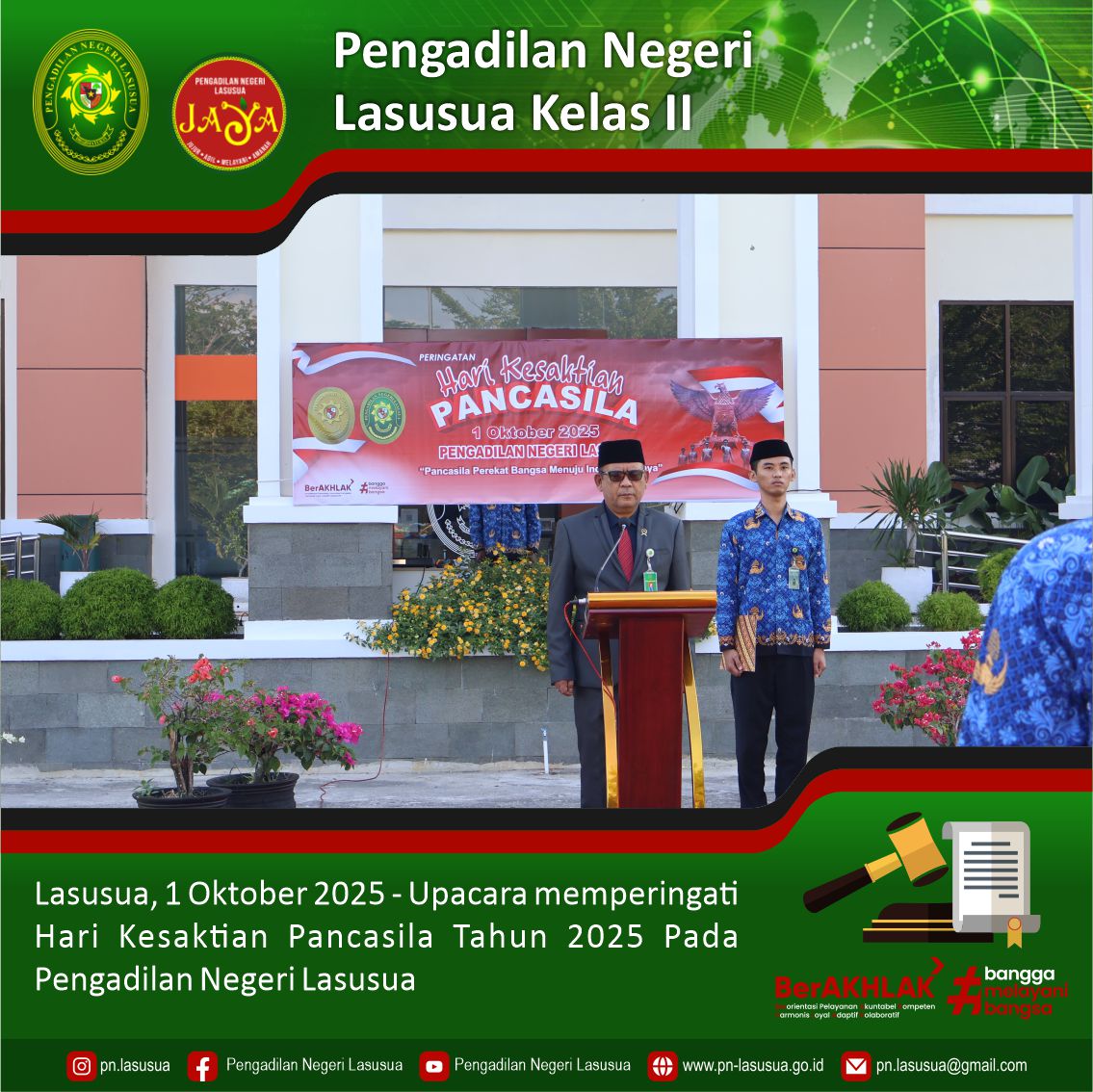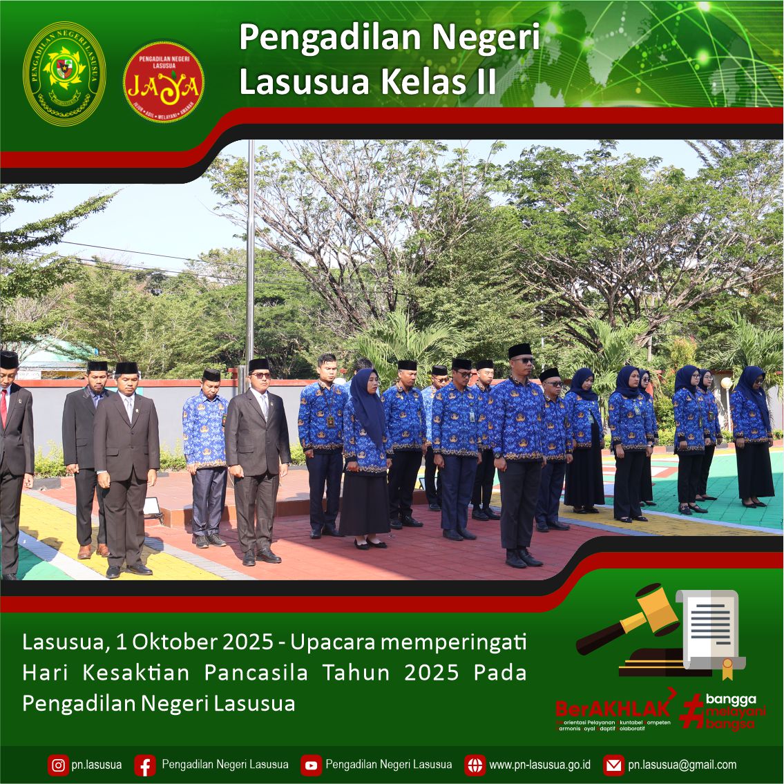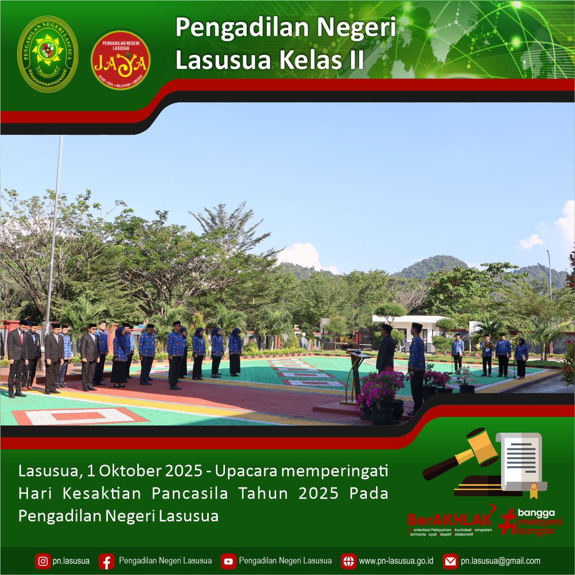 Lasusua, 1 Oktober 2025 - Bertempat di Halaman Pengadilan Negeri Lasusua dilaksanakan Upacara Memperingati Hari Kesaktian Pancasila tema "Pancasila Perekat Bangsa menuju Indonesia Raya" yang di pimpin oleh Ketua Pengadilan Negeri Lasusua Bapak Alfonsus Nahak, S.H., M.H. sebagai Inspektur Upacara dan diikuti oleh para Hakim, Panitera, Sekretaris, Pejabat Strukturan dan Fungsional, para Staf dan PPPK Pengadilan Negeri Lasusua. Tema yang dipilih mencerminkan 1. Pancasila Perekat Bangsa: Menunjukkan bahwa Pancasila berfungsi sebagai fondasi yang mengikat seluruh elemen masyarakat Indonesia, memperkuat persatuan dan kesatuan di tengah keberagaman