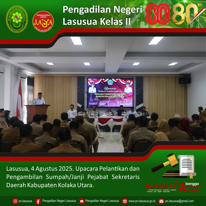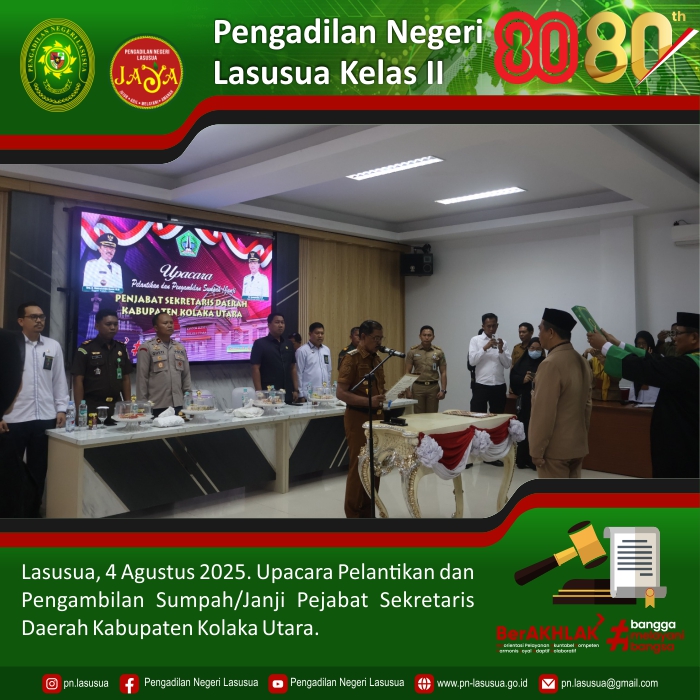 Lasusua, 4 Agustus 2025 - Hakim Pengadilan Negeri Lasusua Bapak Satria Perdana, S.H., M.H. menghadiri Upacara Pelantikan dan Pengambilan Sumpah/Janji Pejabat Sekretaris Daerah Kabupaten Kolaka Utara yang dilaksanakan di Kantor Bupati Kabupaten Kolaka Utara.