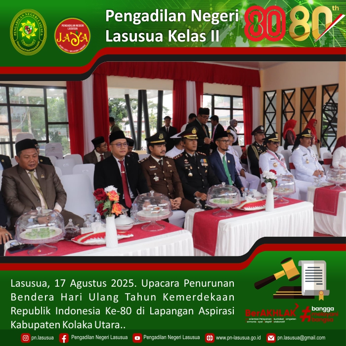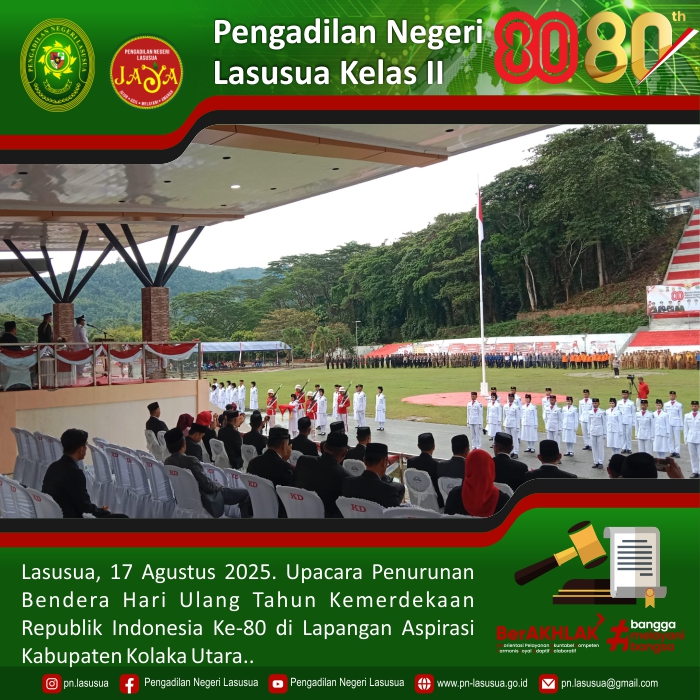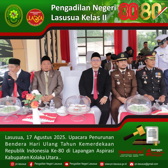 Lasusua, 17 Agustus 2025 - Kegiatan Upacara Penurunan Bendera dalam Rangka Hari Ulang Tahun Kemerdekaan Republik Indonesia ke-80 dengan tema "Berdatu Berdaulat, Rakyat Sejahtera, Indonesia Maju" yang dilaksanakan di Lapangan Aspirasi Pemerintah Kabupaten Kolaka Utara yang di ikuti oleh Hakim Pengadilan Negeri Lasusua Bapak Lian Christo Sianturi, S.H.